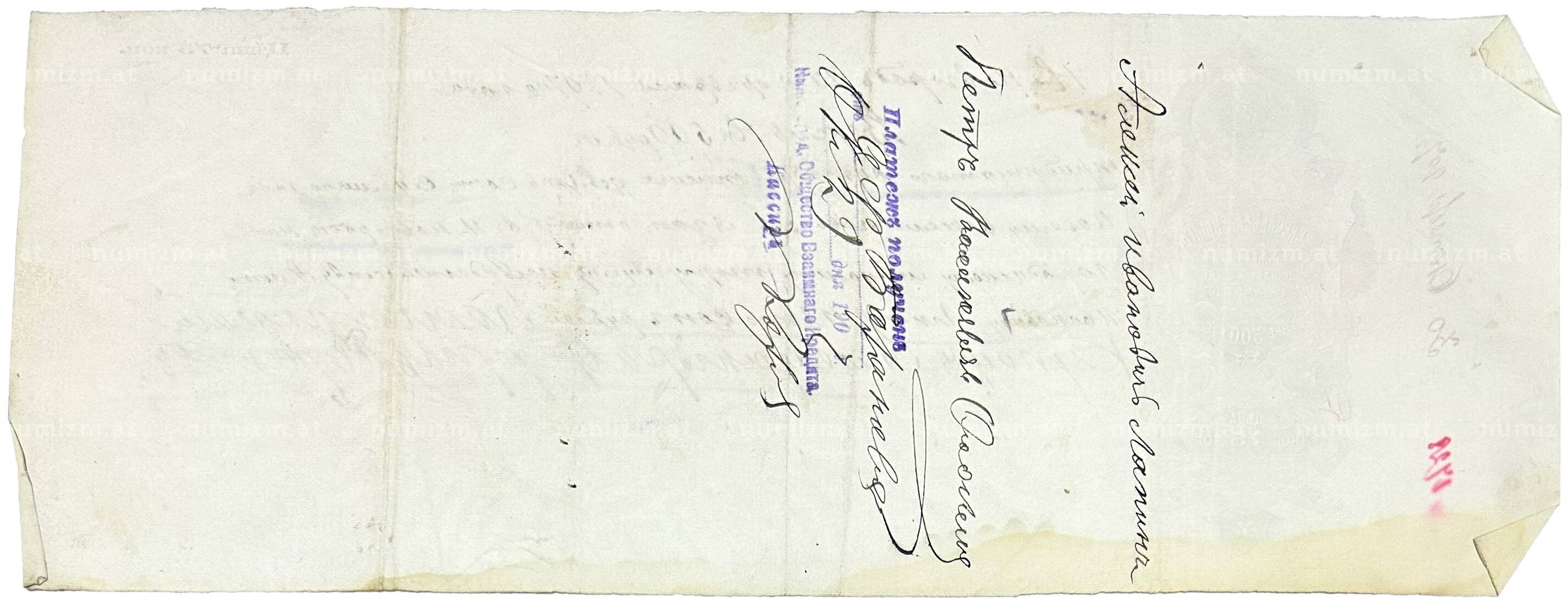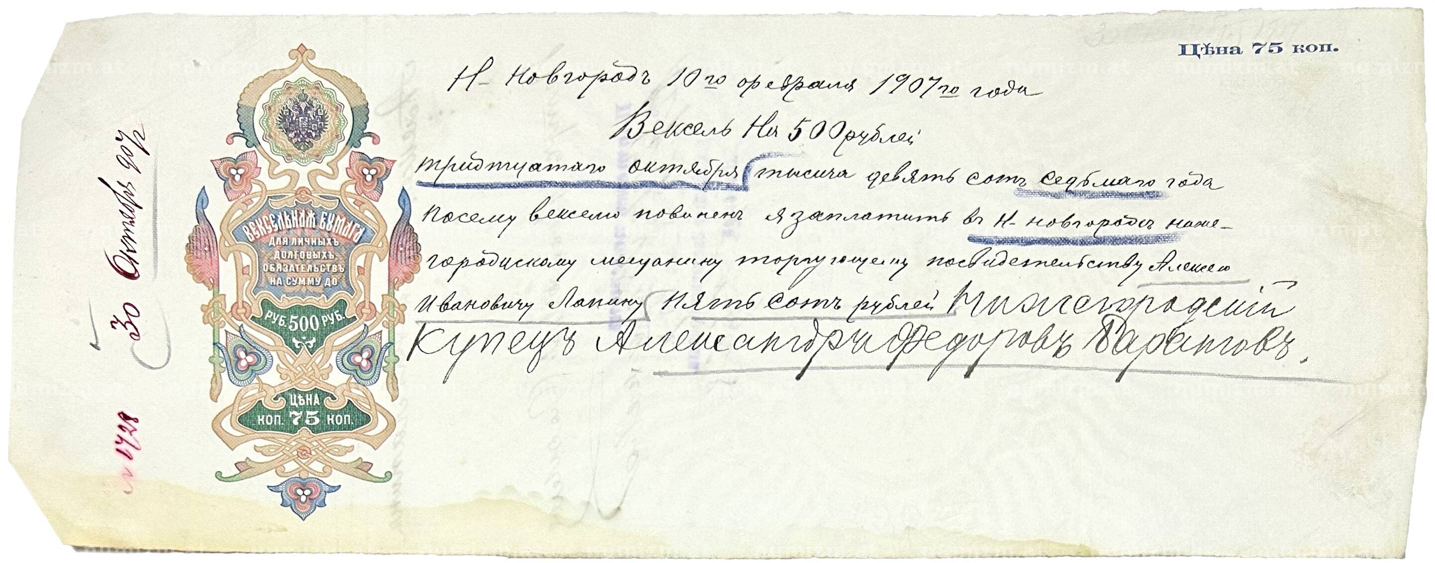 Купить Вексель 1907 года на сумму 500 рублей Российская Империя (Нижний Новгород) по привлекательной цене можно в нашем интернет-магазине — Вам достаточно оформить заказ на сайте. Все монеты, представленные в каталоге, находятся в наличии на нашем складе.