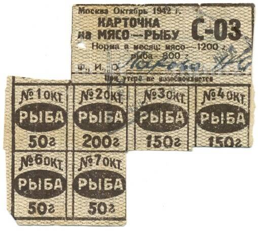 20.01.2025Интернет магазин «Нумизмат» предлагает приобрести Продуктовая карточка на мясо и рыбу 1942 года (Москва).