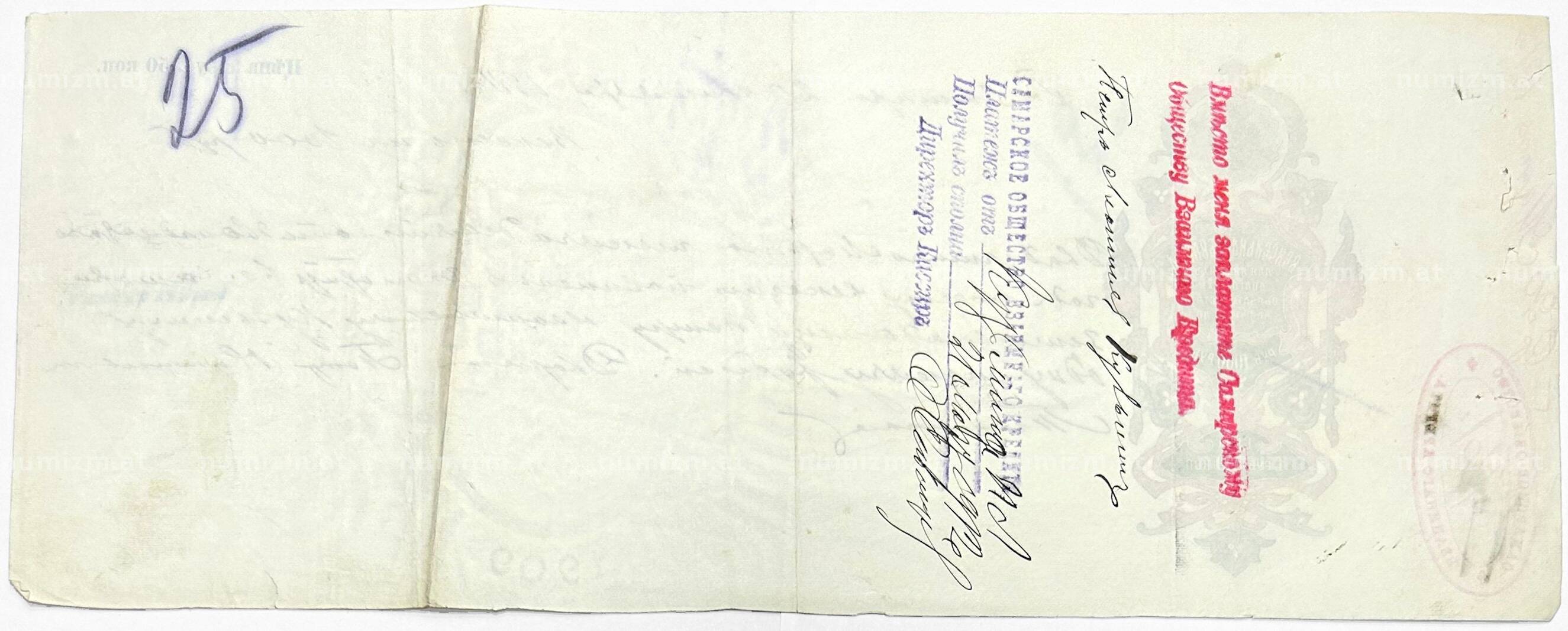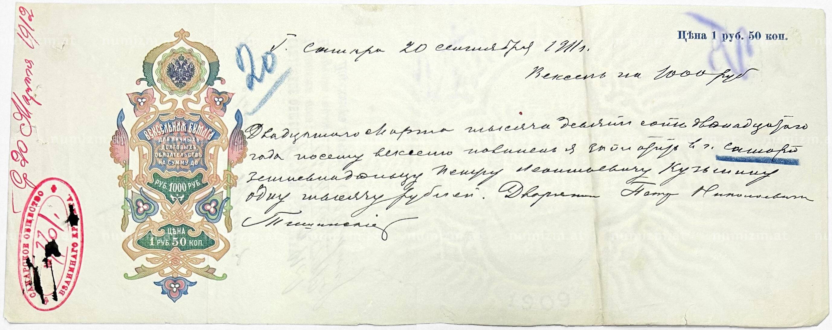 Купить Вексель 1911 года на сумму 1000 рублей Российская Империя (Самара) по привлекательной цене можно в нашем интернет-магазине — Вам достаточно оформить заказ на сайте. Все монеты, представленные в каталоге, находятся в наличии на нашем складе.