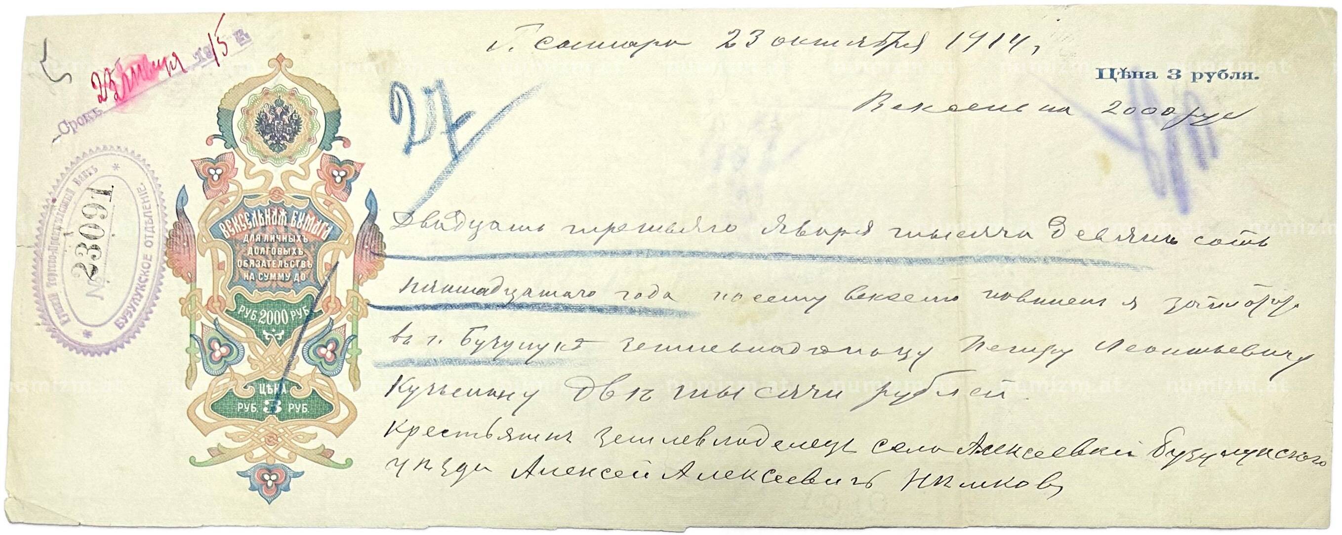 Купить Вексель 1914 года на сумму 2000 рублей Российская Империя (Самара) по привлекательной цене можно в нашем интернет-магазине — Вам достаточно оформить заказ на сайте. Все монеты, представленные в каталоге, находятся в наличии на нашем складе.