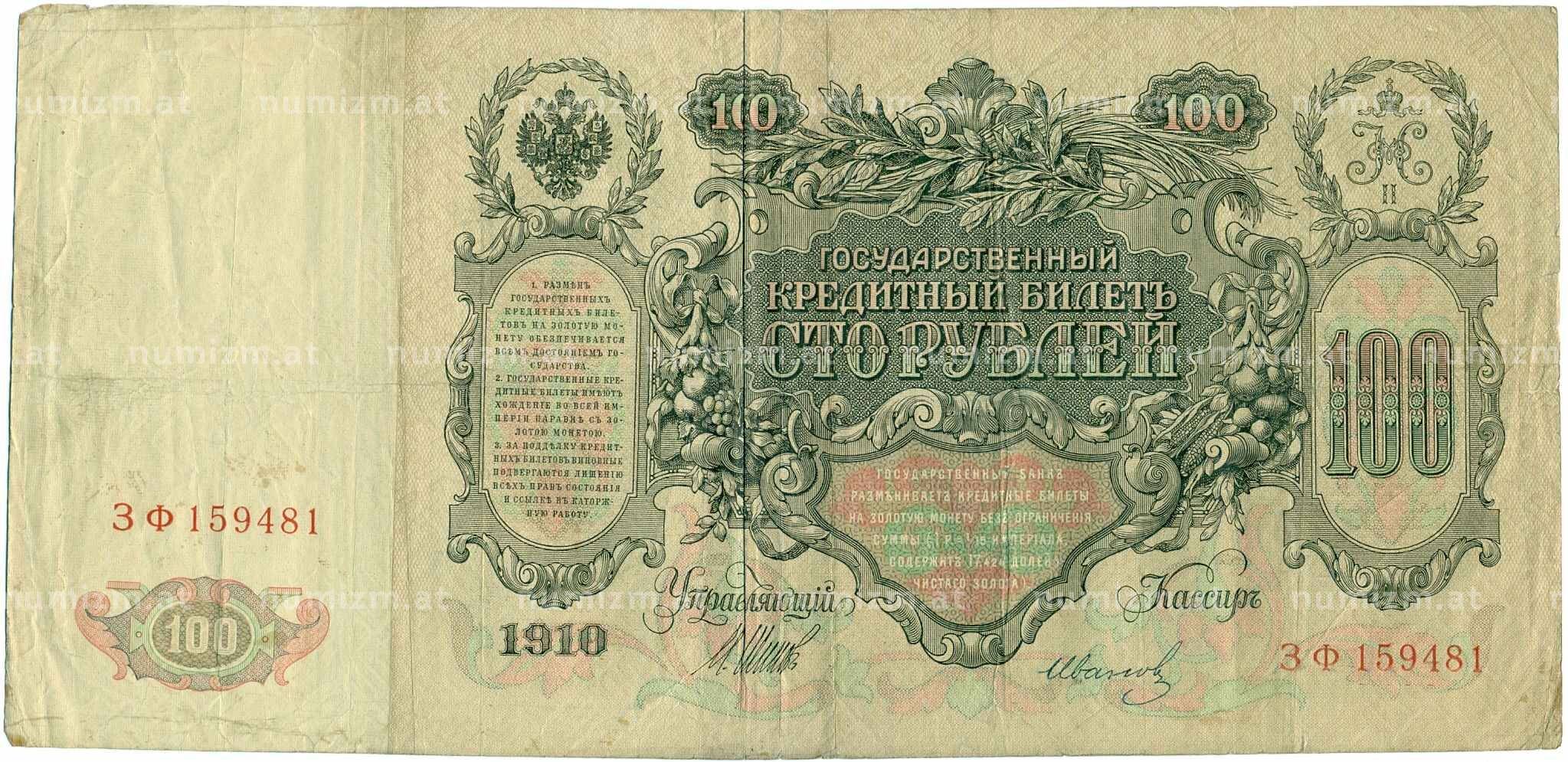 Купить 100 рублей 1910 года Шипов / Иванов по привлекательной цене можно в нашем интернет-магазине — Вам достаточно оформить заказ на сайте. Все монеты, представленные в каталоге, находятся в наличии на нашем складе.