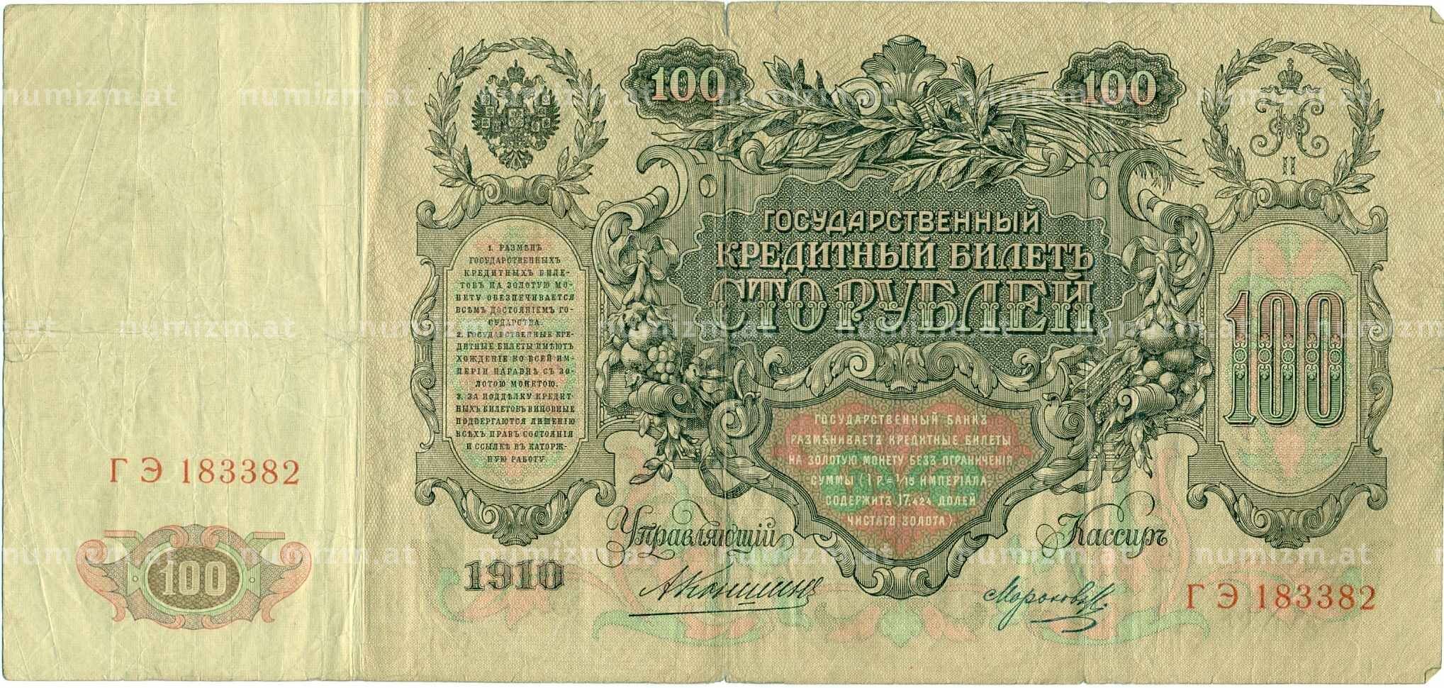 Купить 100 рублей 1910 года Коншин / Морозов по привлекательной цене можно в нашем интернет-магазине — Вам достаточно оформить заказ на сайте. Все монеты, представленные в каталоге, находятся в наличии на нашем складе.