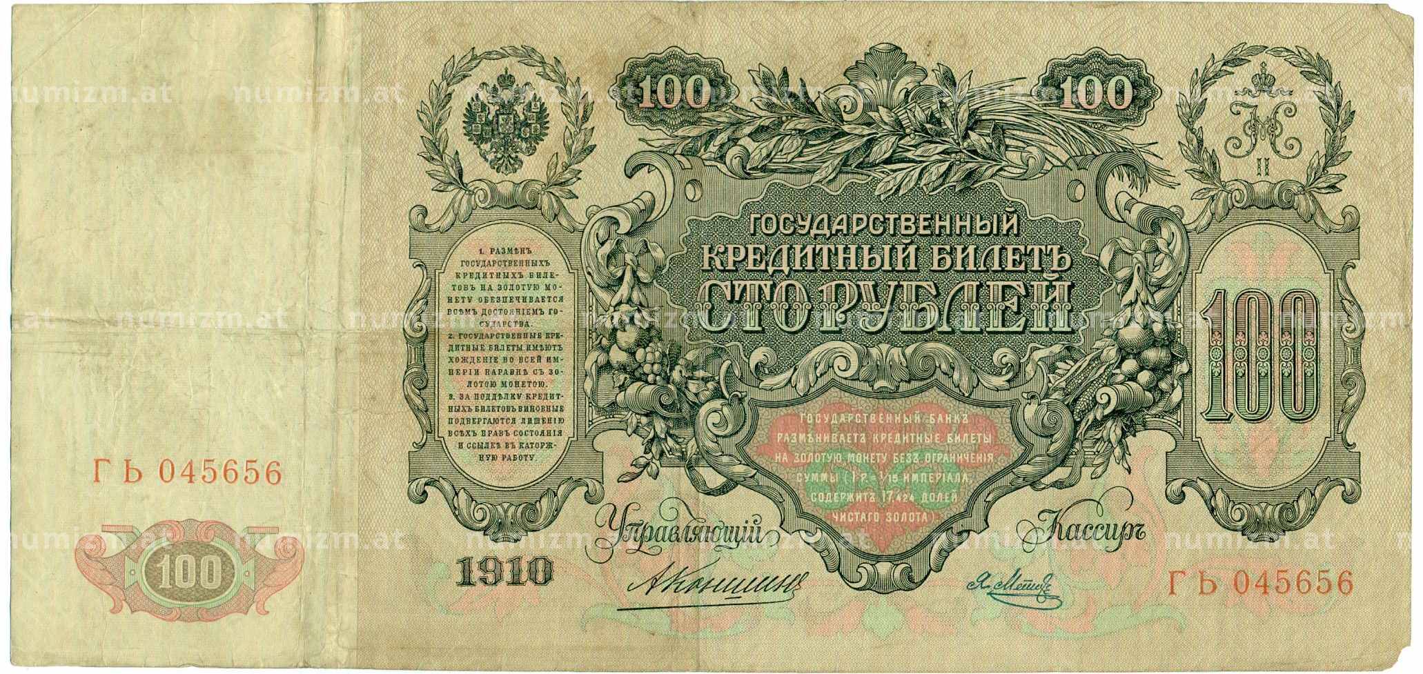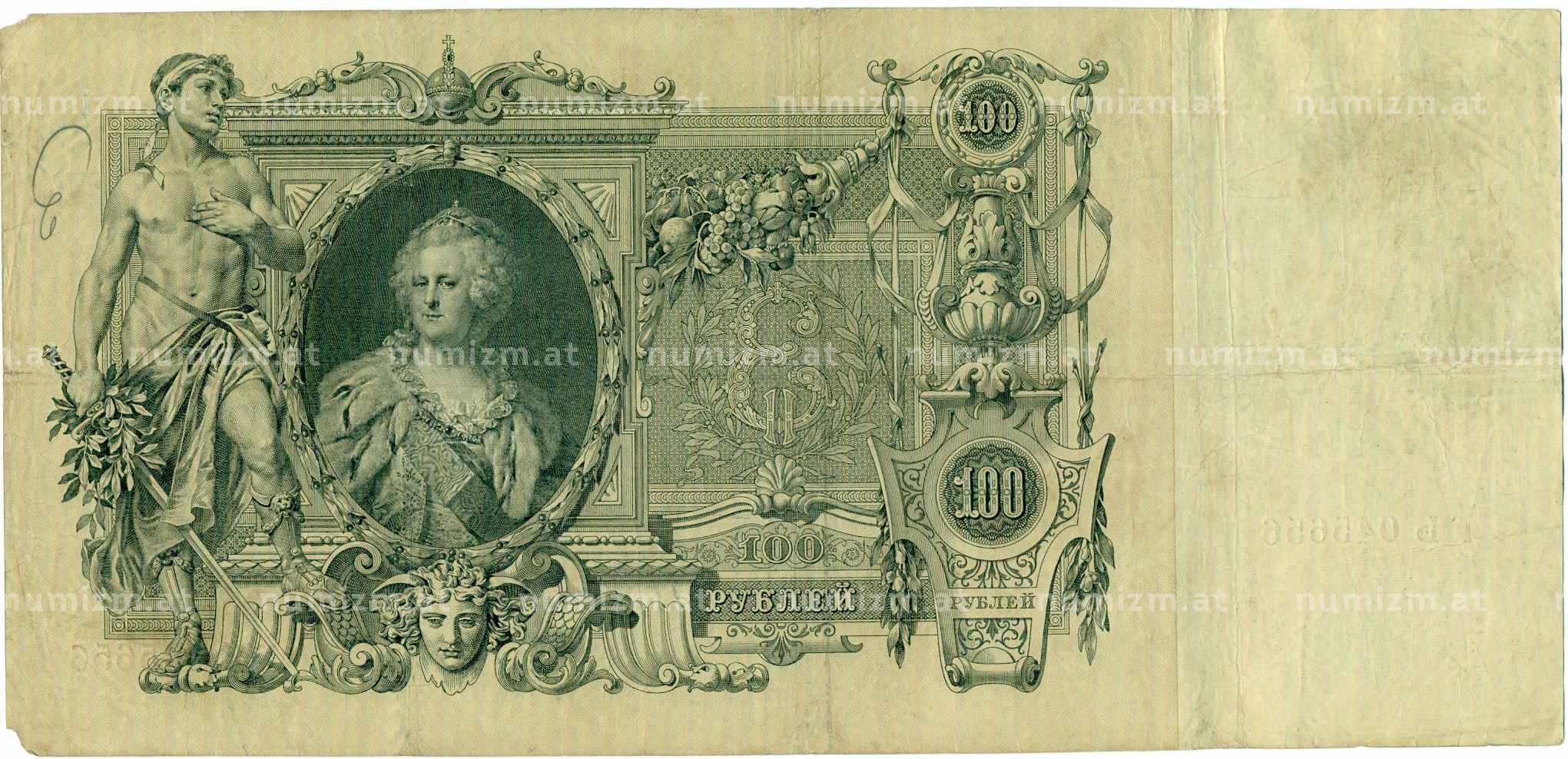 20.01.2025Интернет магазин «Нумизмат» предлагает приобрести 100 рублей 1910 года Коншин / Метц.