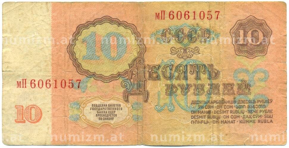 • Банкнота 10 рублей 1961 года (Артикул: B1-12430) — Фото №1 Банкнота 10 рублей 1961 года (Артикул: B1-12430) — Фото №2