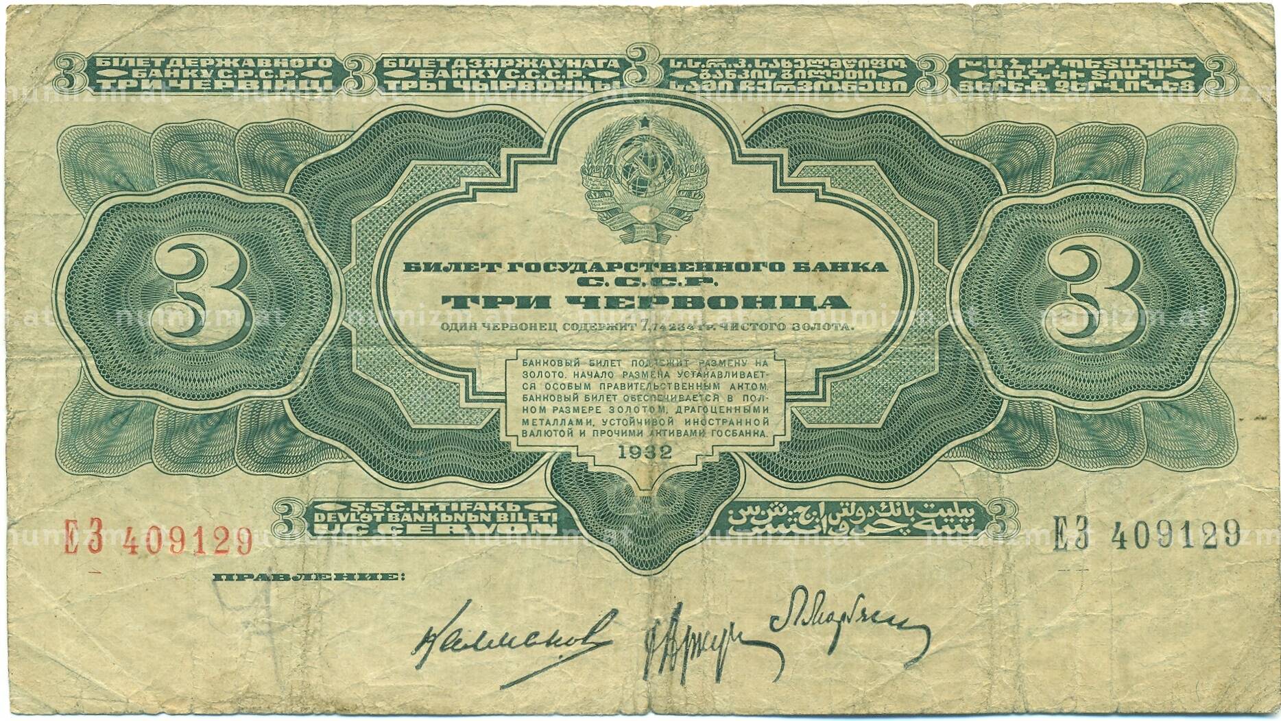 Банкнота 3 червонца 1932 года (Артикул: B1-12590): подробные характеристики, качественные фотографии в высоком разрешении, низкая цена.