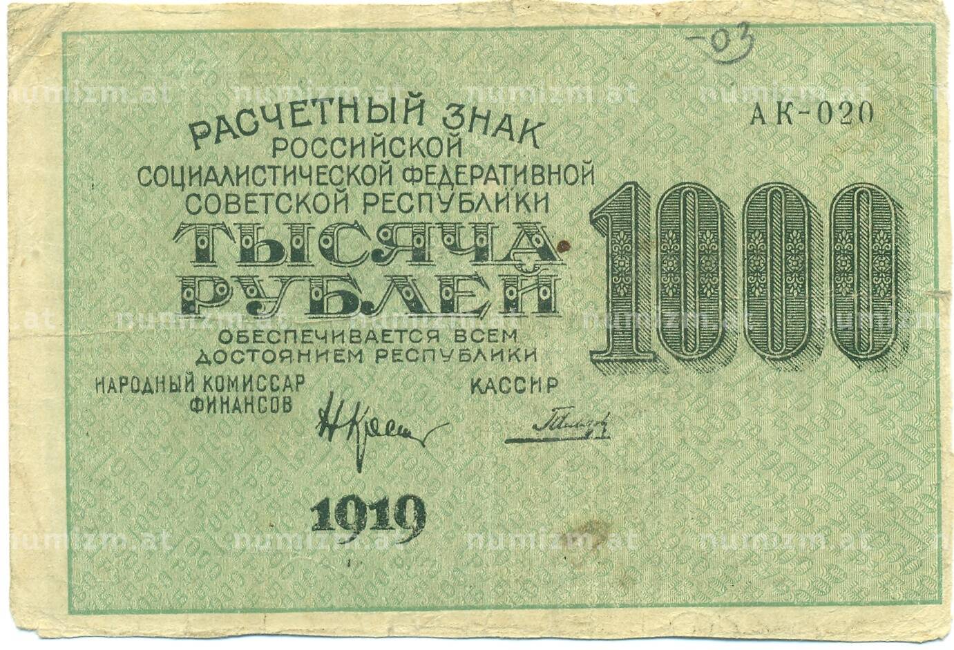 20.01.2025Интернет магазин «Нумизмат» предлагает приобрести 1000 рублей 1919 года.