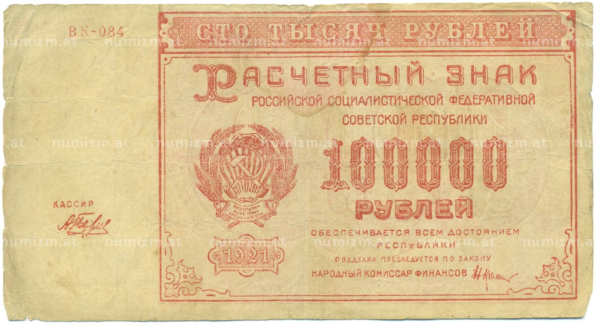 20.01.2025Интернет магазин «Нумизмат» предлагает приобрести 100000 рублей 1921 года.