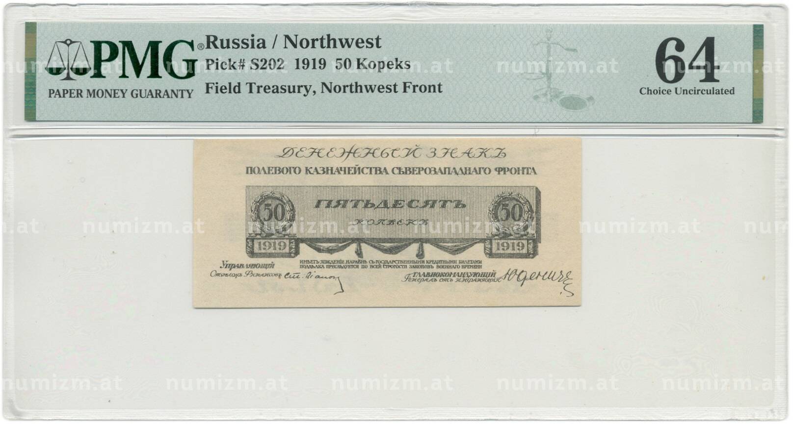 Купить 50 копеек 1919 года Полевое казначейство Северозападного фронта — в слабе PMG (Choice UNC 64) по привлекательной цене можно в нашем интернет-магазине — Вам достаточно оформить заказ на сайте. Все монеты, представленные в каталоге, находятся в наличии на нашем складе.