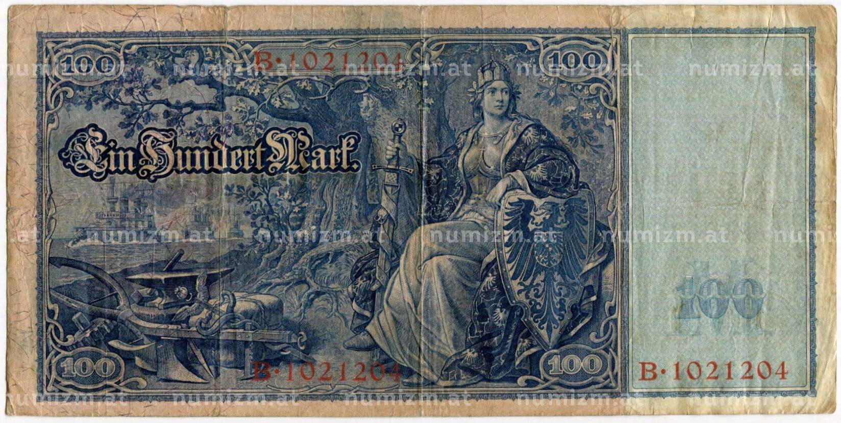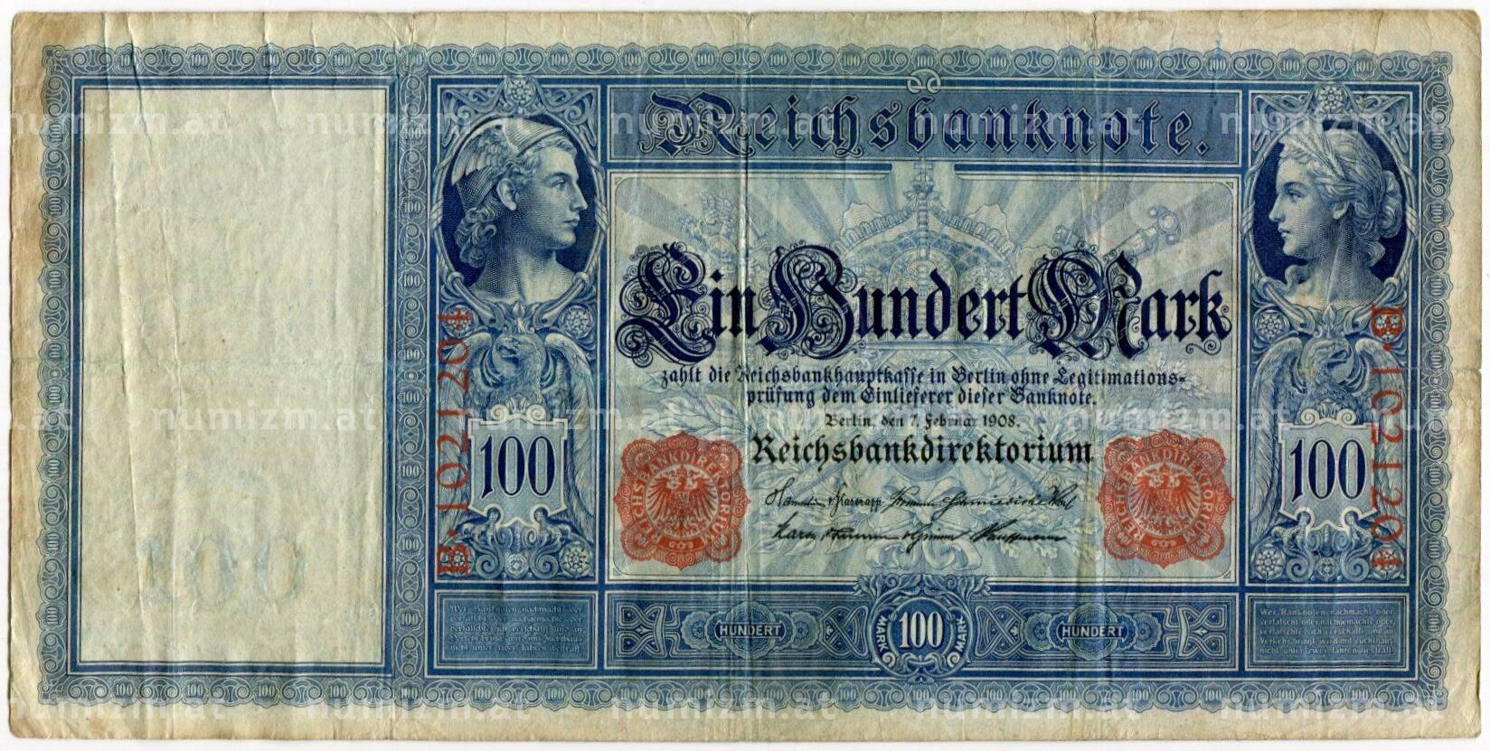 Банкнота 100 марок 1908 года Германия (Артикул: B2-10292): подробные характеристики, качественные фотографии в высоком разрешении, низкая цена.
