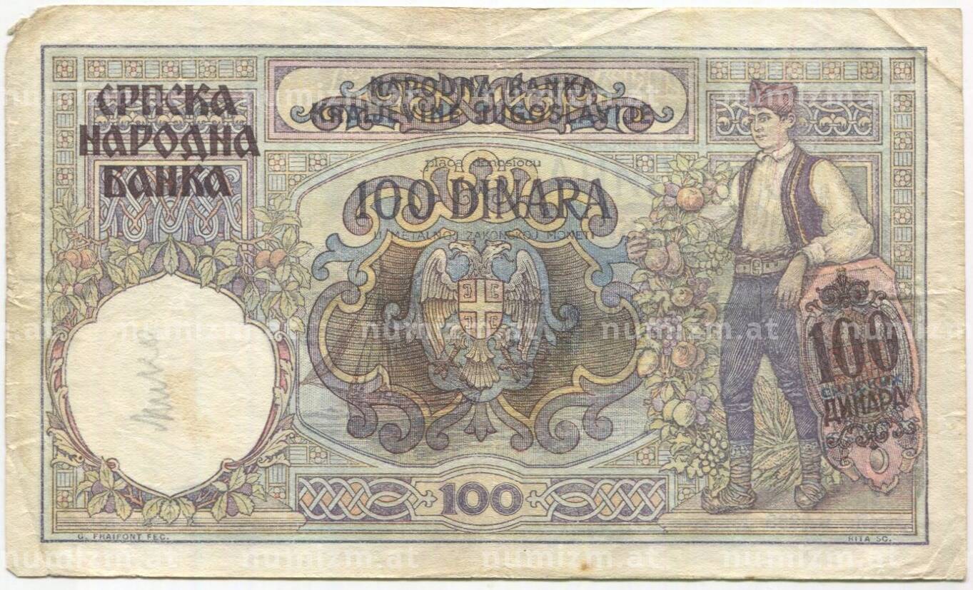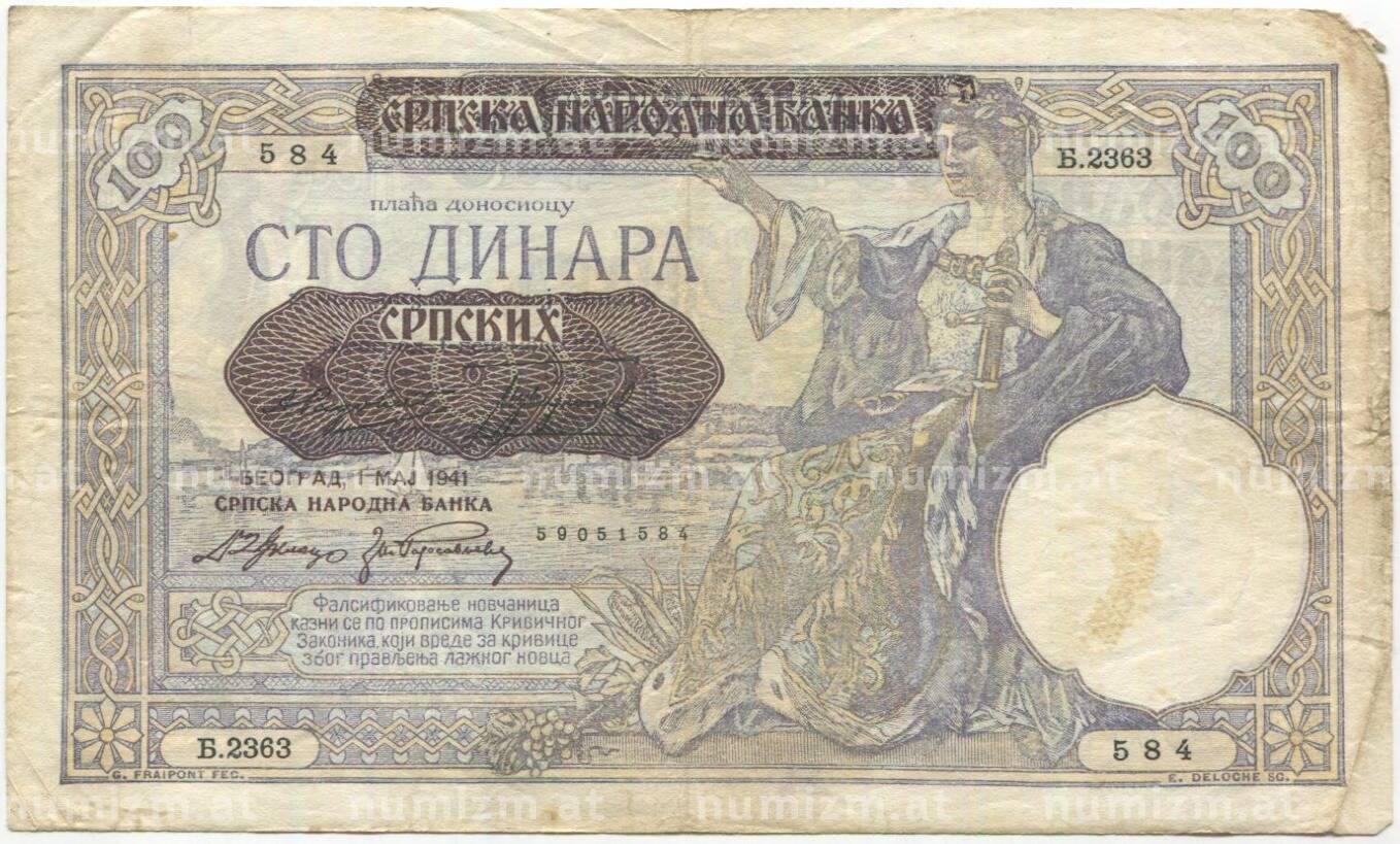 Банкнота 100 динаров 1941 года Сербия (Артикул: B2-11482): подробные характеристики, качественные фотографии в высоком разрешении, низкая цена.