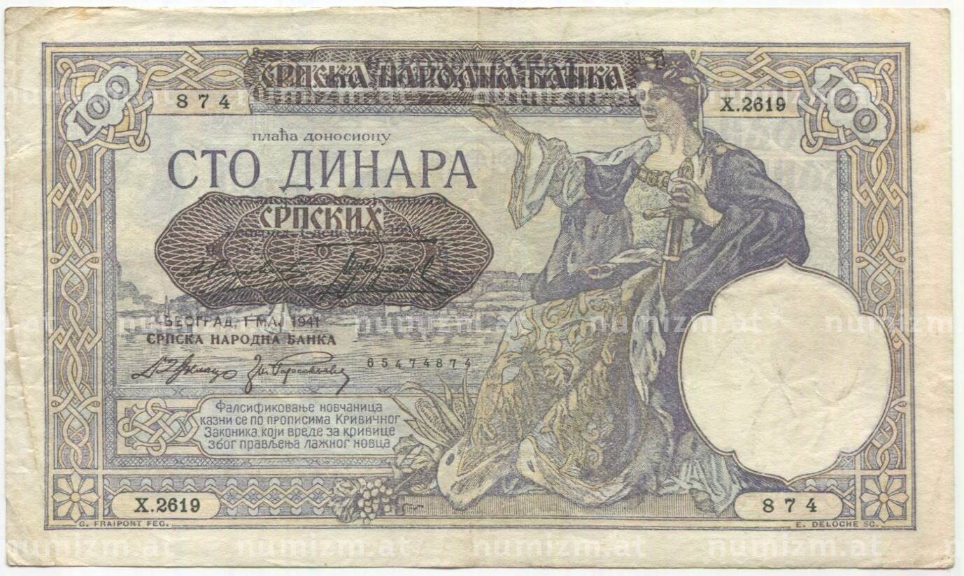 Банкнота 100 динаров 1941 года Сербия (Артикул: B2-11492): подробные характеристики, качественные фотографии в высоком разрешении, низкая цена.