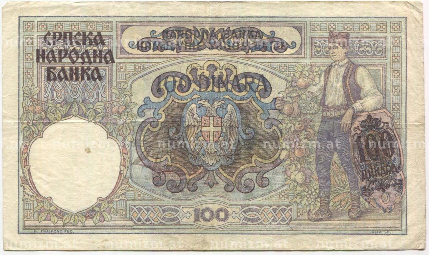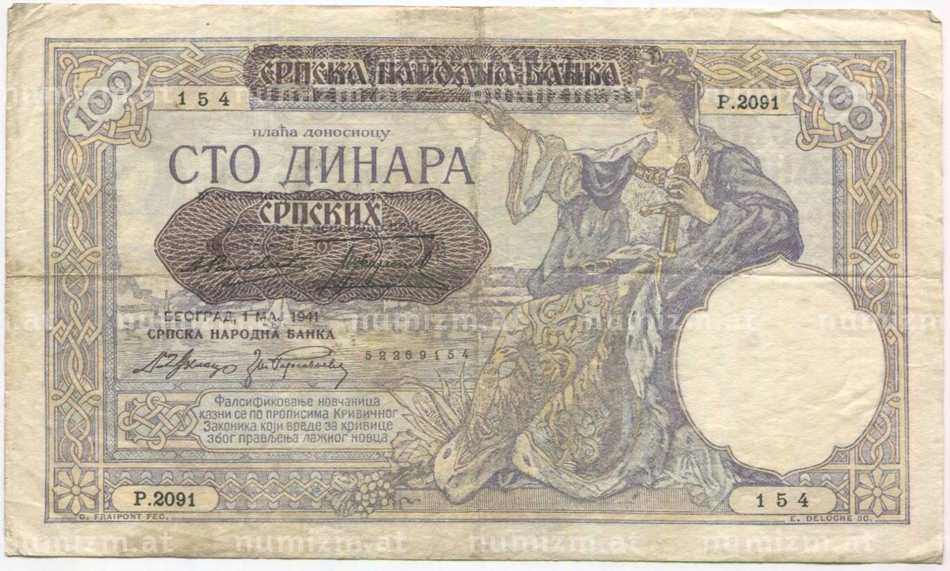 Банкнота 100 динаров 1941 года Сербия (Артикул: B2-11502): подробные характеристики, качественные фотографии в высоком разрешении, низкая цена.