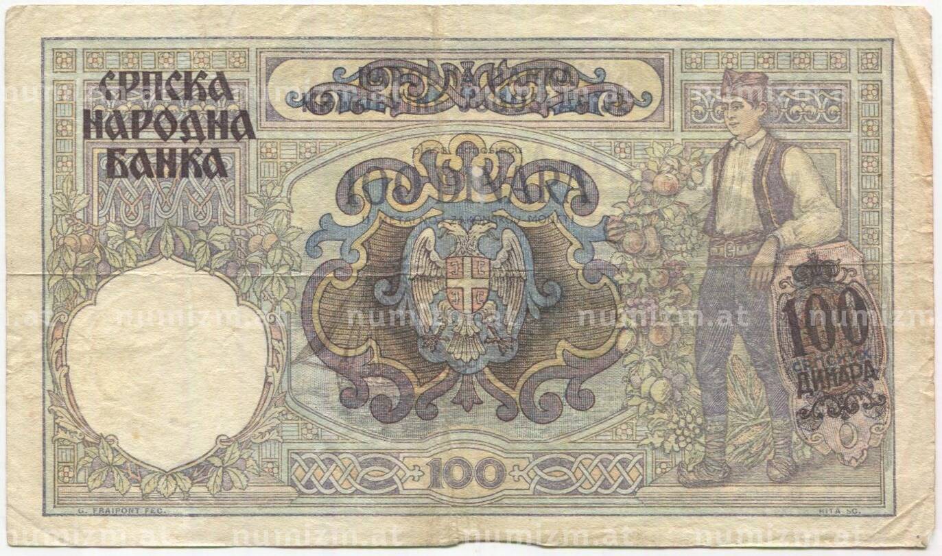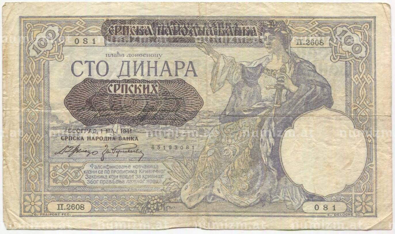 Банкнота 100 динаров 1941 года Сербия (Артикул: B2-11506): подробные характеристики, качественные фотографии в высоком разрешении, низкая цена.