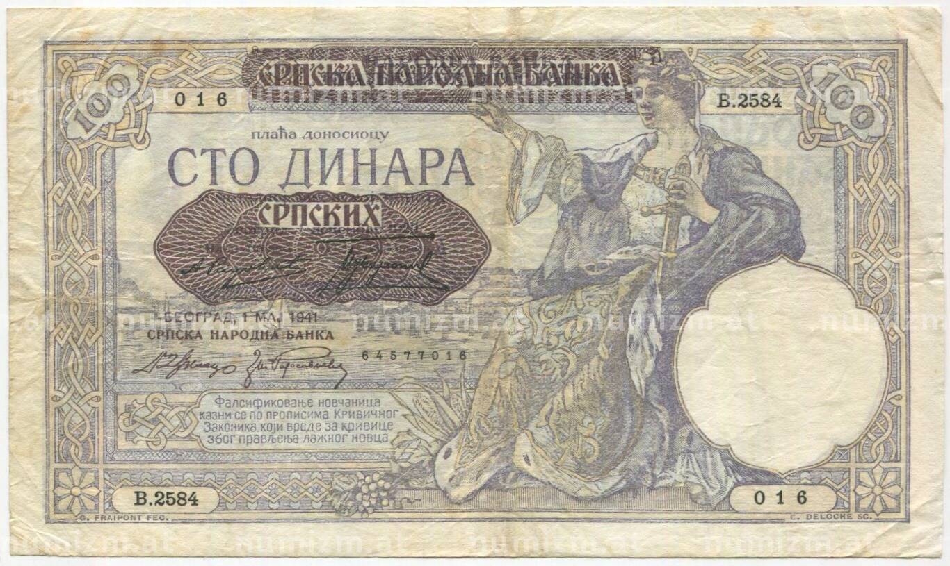 Банкнота 100 динаров 1941 года Сербия (Артикул: B2-11591): подробные характеристики, качественные фотографии в высоком разрешении, низкая цена.