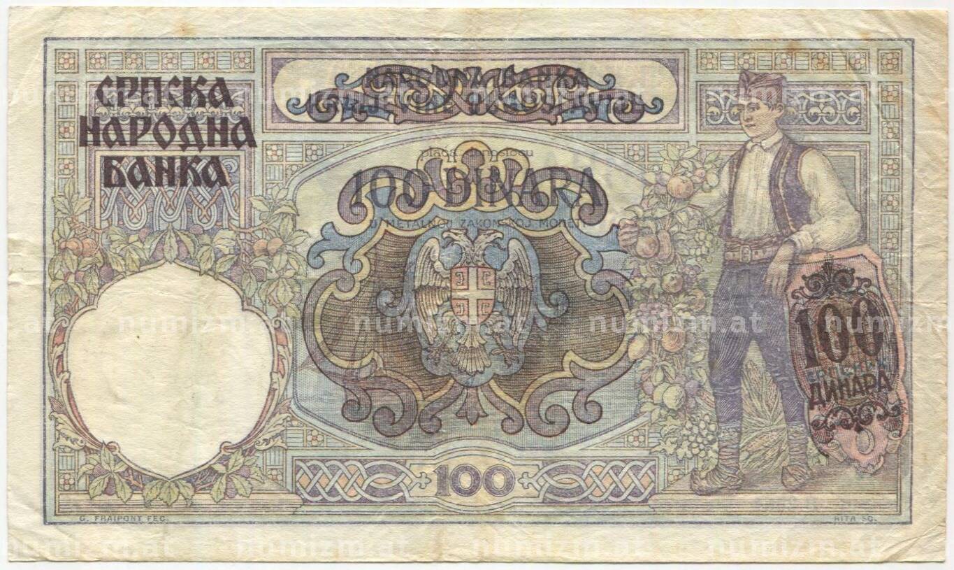 • Банкнота 100 динаров 1941 года Сербия (Артикул: B2-11591) — Фото №1 Банкнота 100 динаров 1941 года Сербия (Артикул: B2-11591) — Фото №2