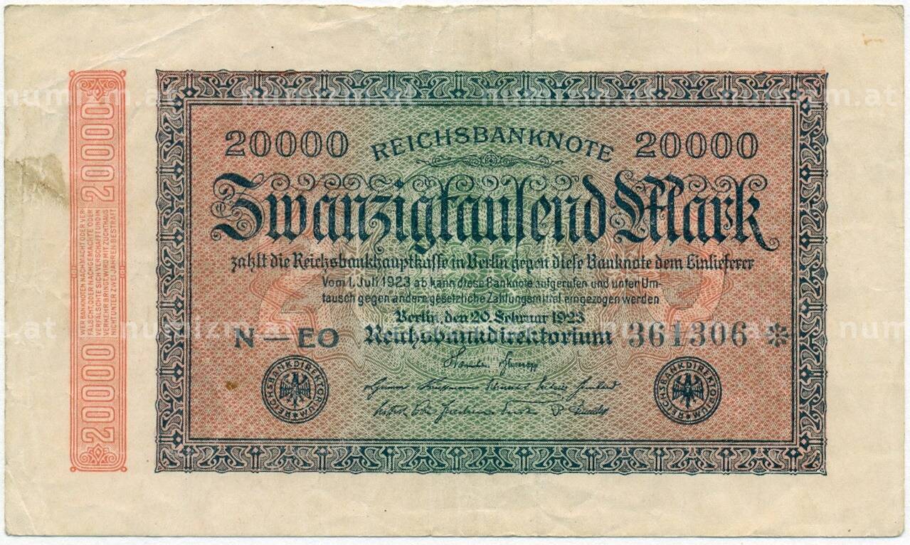 Банкнота 20000 марок 1923 года Германия (Артикул: B2-11964): подробные характеристики, качественные фотографии в высоком разрешении, низкая цена.