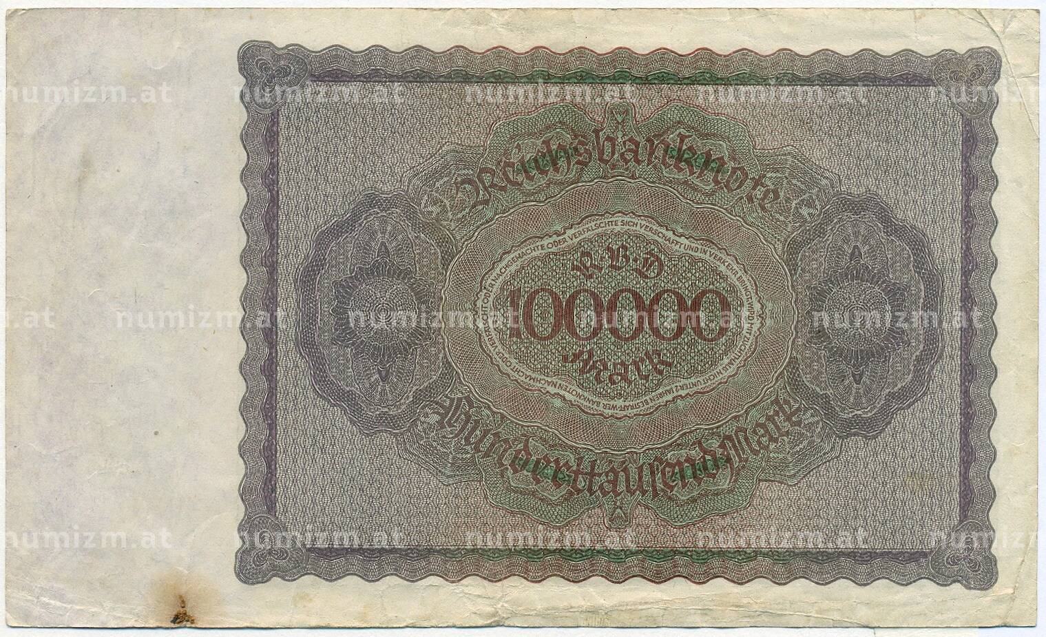 Банкнота 100000 марок 1923 года Германия (Артикул: B2-12628): подробные характеристики, качественные фотографии в высоком разрешении, низкая цена.
