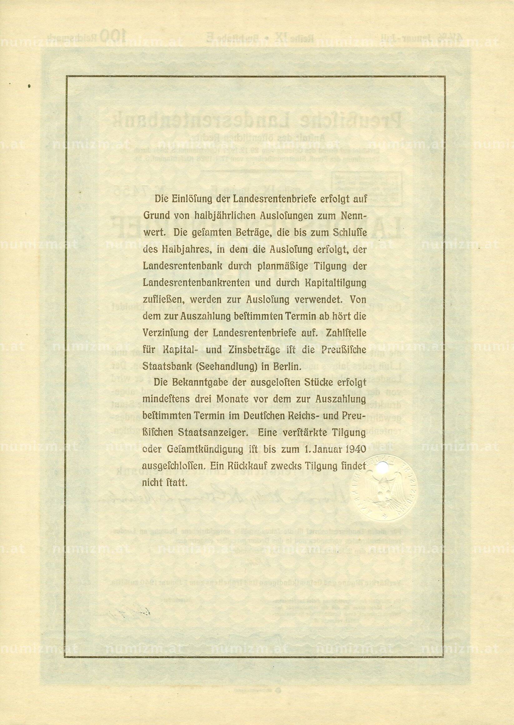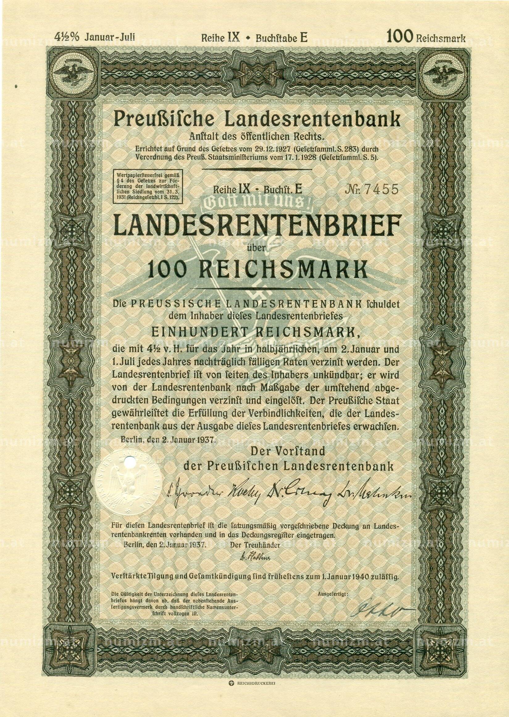 4 1/2% облигация на 100 рейхсмарок 1937 года Германия (Прусский государственный пенсионный банк) (Артикул: B2-13275): подробные характеристики, качественные фотографии в высоком разрешении, низкая цена.