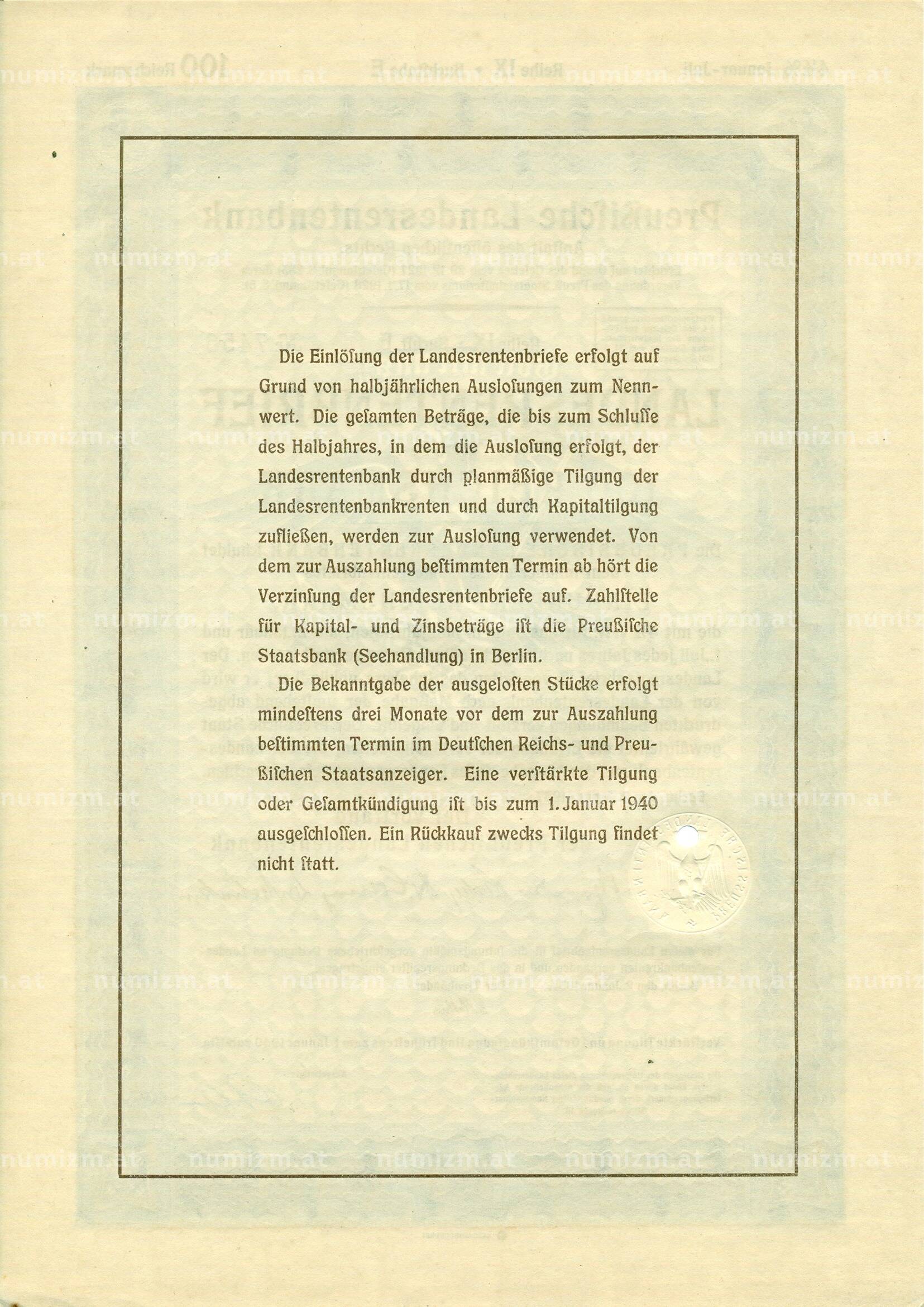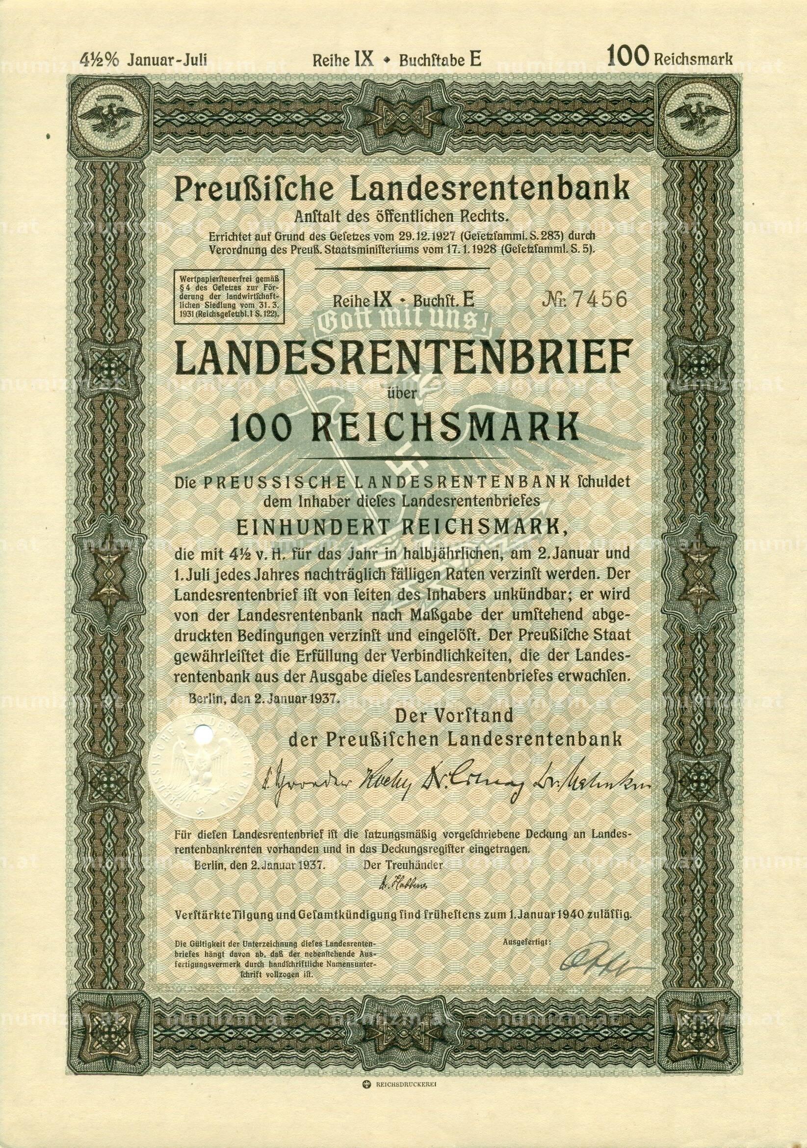 4 1/2% облигация на 100 рейхсмарок 1937 года Германия (Прусский государственный пенсионный банк) (Артикул: B2-13276): подробные характеристики, качественные фотографии в высоком разрешении, низкая цена.