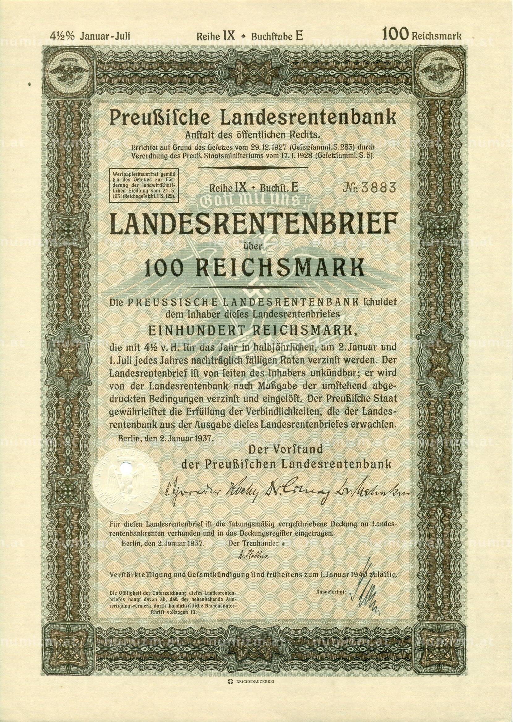 Купить 4 1/2% облигация на 100 рейхсмарок 1937 года Германия (Прусский государственный пенсионный банк) по привлекательной цене можно в нашем интернет-магазине — Вам достаточно оформить заказ на сайте. Все монеты, представленные в каталоге, находятся в наличии на нашем складе.
