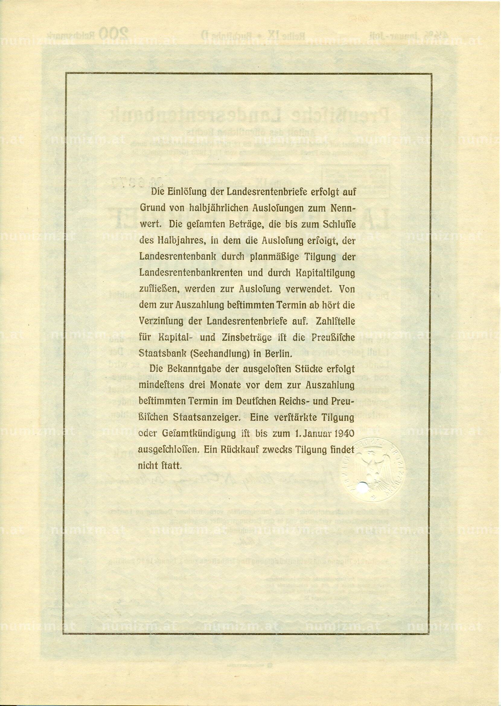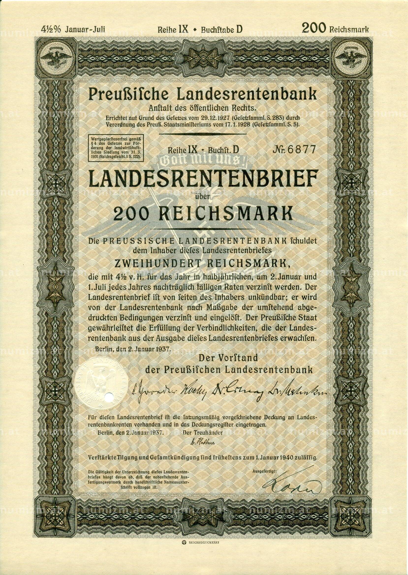 4 1/2% облигация на 200 рейхсмарок 1937 года Германия (Прусский государственный пенсионный банк) (Артикул: B2-13287): подробные характеристики, качественные фотографии в высоком разрешении, низкая цена.