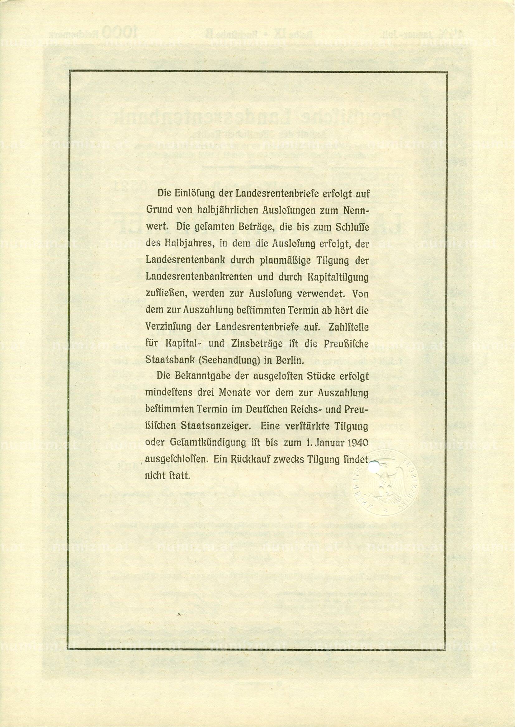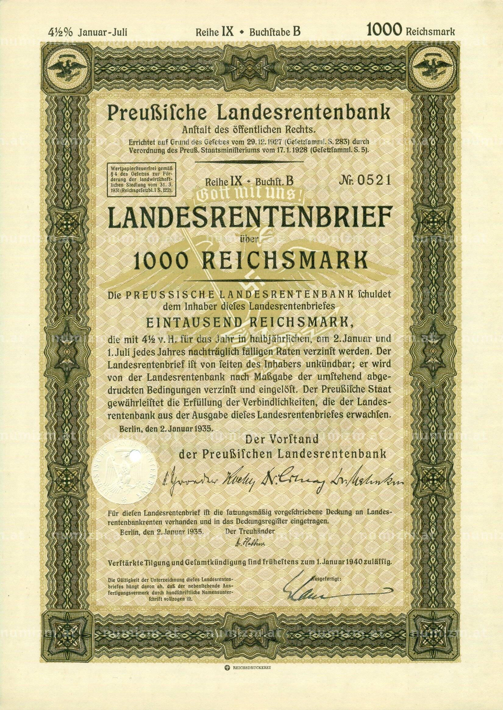 4 1/2% облигация на 1000 рейхсмарок 1935 года Германия (Прусский государственный пенсионный банк) (Артикул: B2-13291): подробные характеристики, качественные фотографии в высоком разрешении, низкая цена.