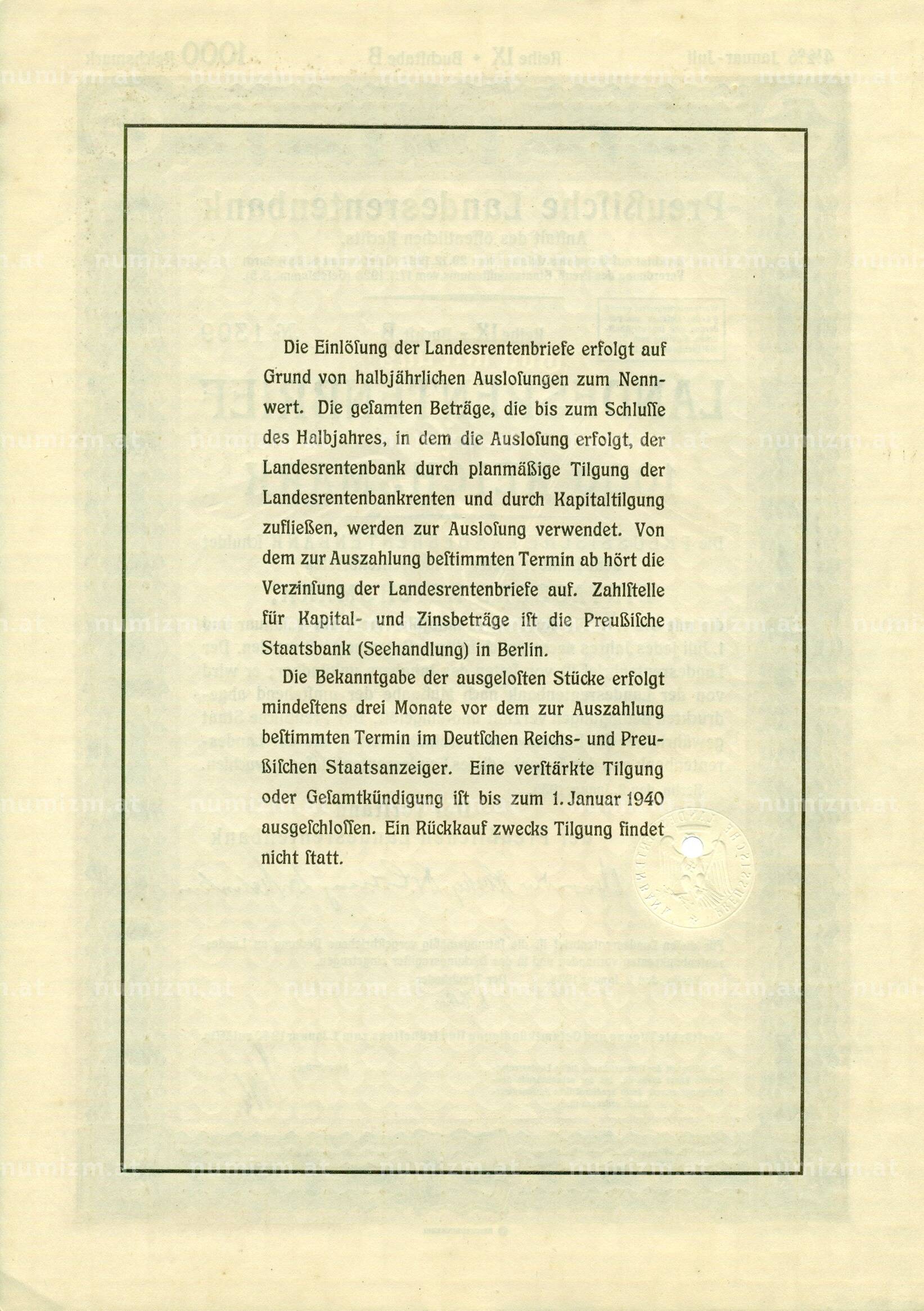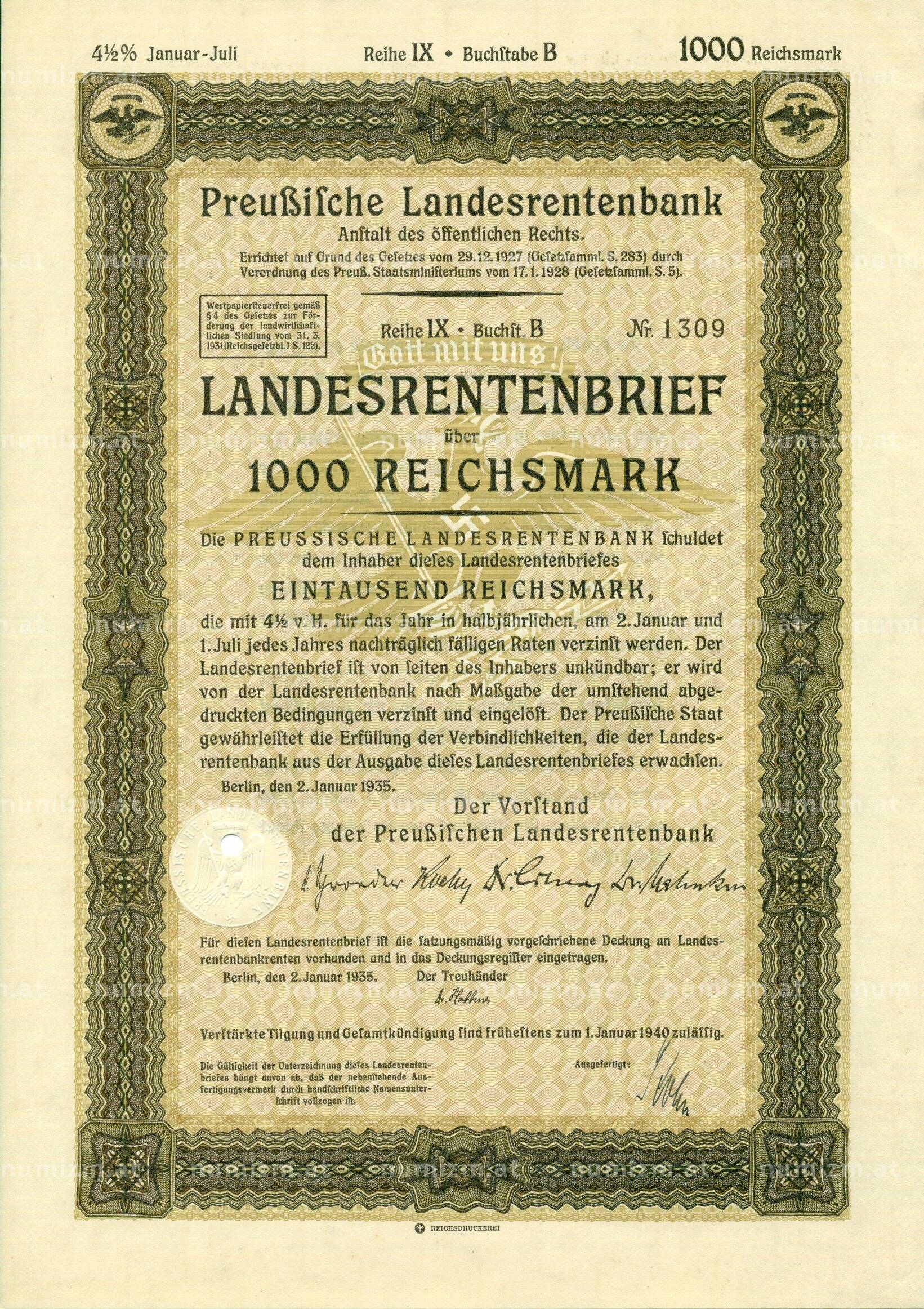 Купить 4 1/2% облигация на 1000 рейхсмарок 1935 года Германия (Прусский государственный пенсионный банк) по привлекательной цене можно в нашем интернет-магазине — Вам достаточно оформить заказ на сайте. Все монеты, представленные в каталоге, находятся в наличии на нашем складе.