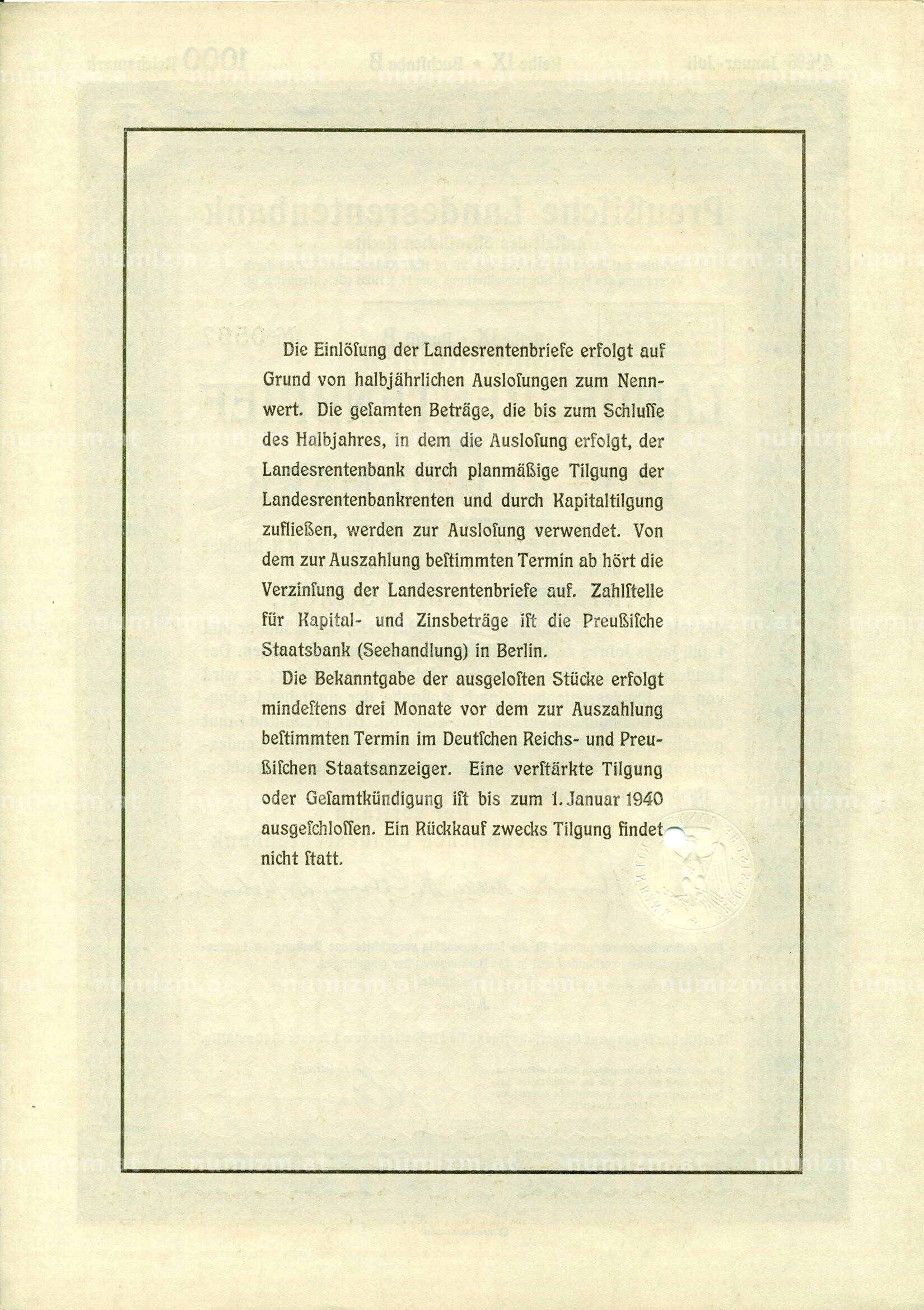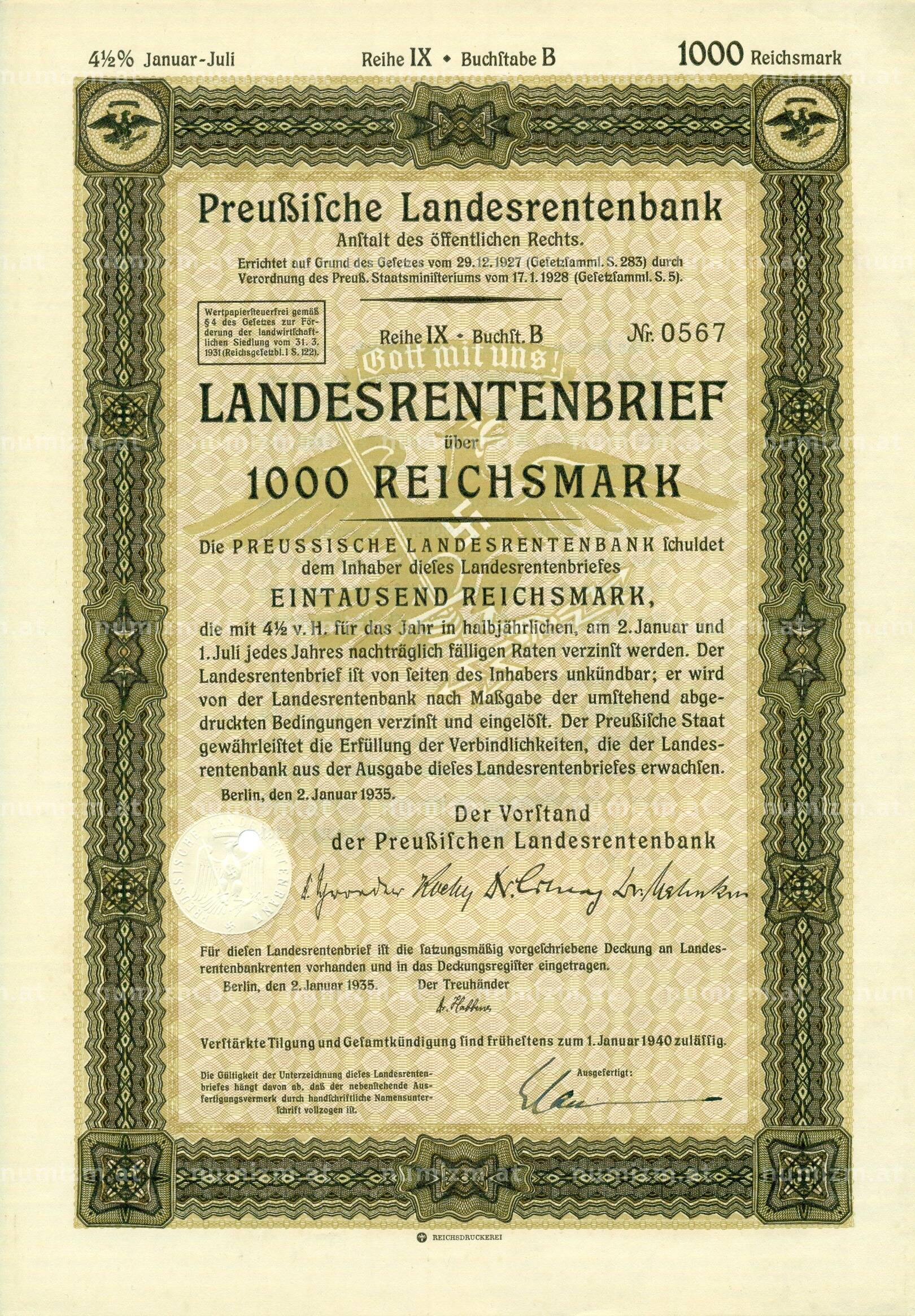 Интернет магазин «Нумизмат» предлагает приобрести 4 1/2% облигация на 1000 рейхсмарок 1935 года Германия (Прусский государственный пенсионный банк).
