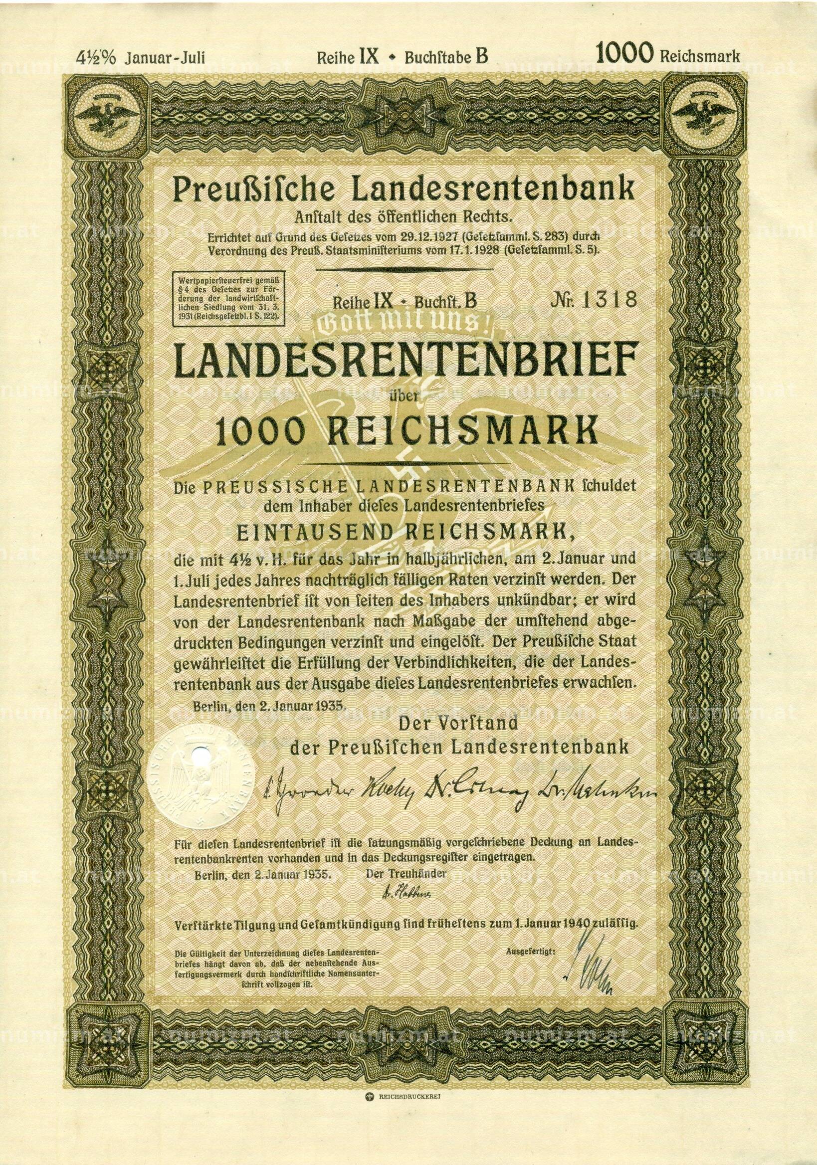 Купить 4 1/2% облигация на 1000 рейхсмарок 1935 года Германия (Прусский государственный пенсионный банк) по привлекательной цене можно в нашем интернет-магазине — Вам достаточно оформить заказ на сайте. Все монеты, представленные в каталоге, находятся в наличии на нашем складе.