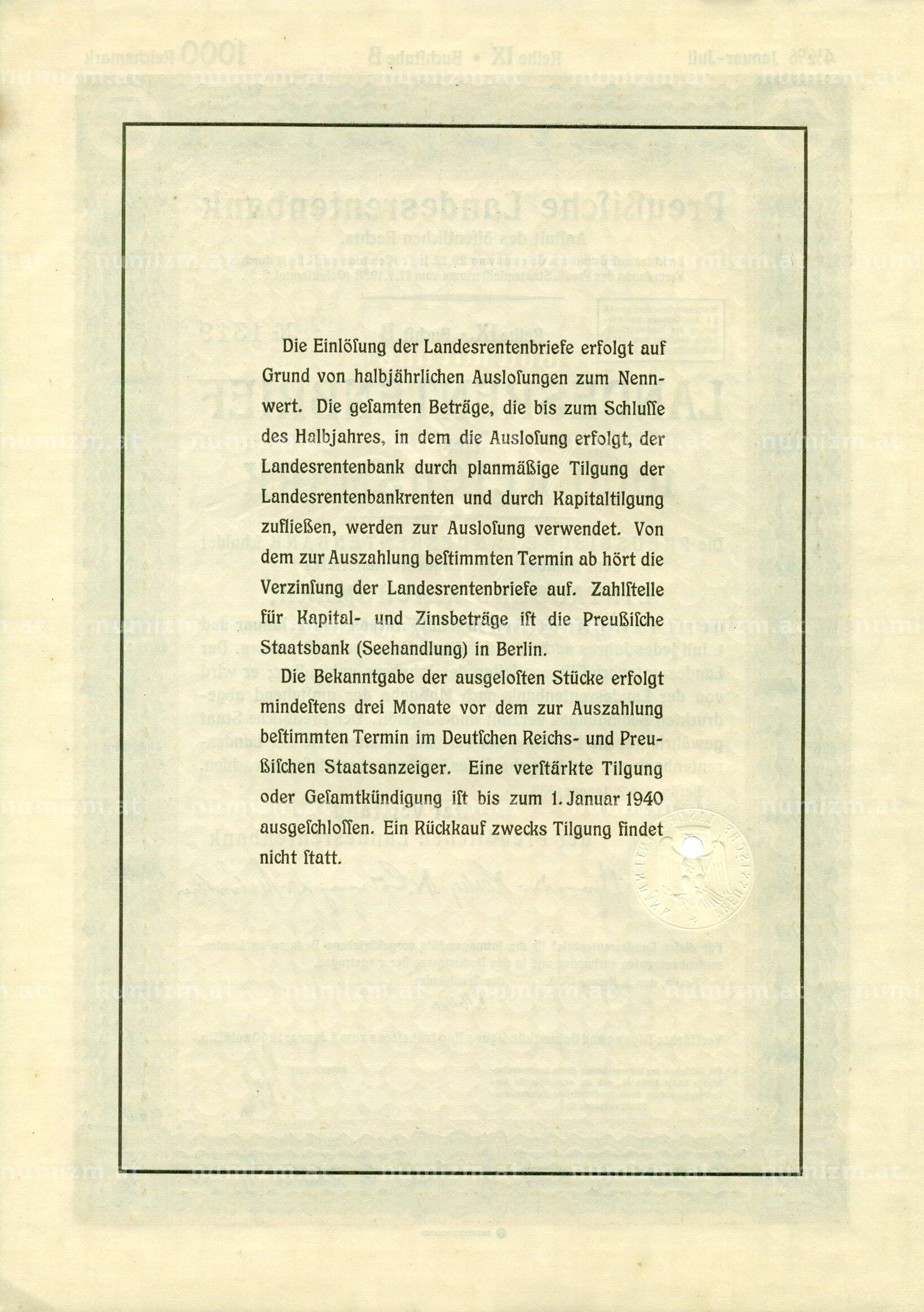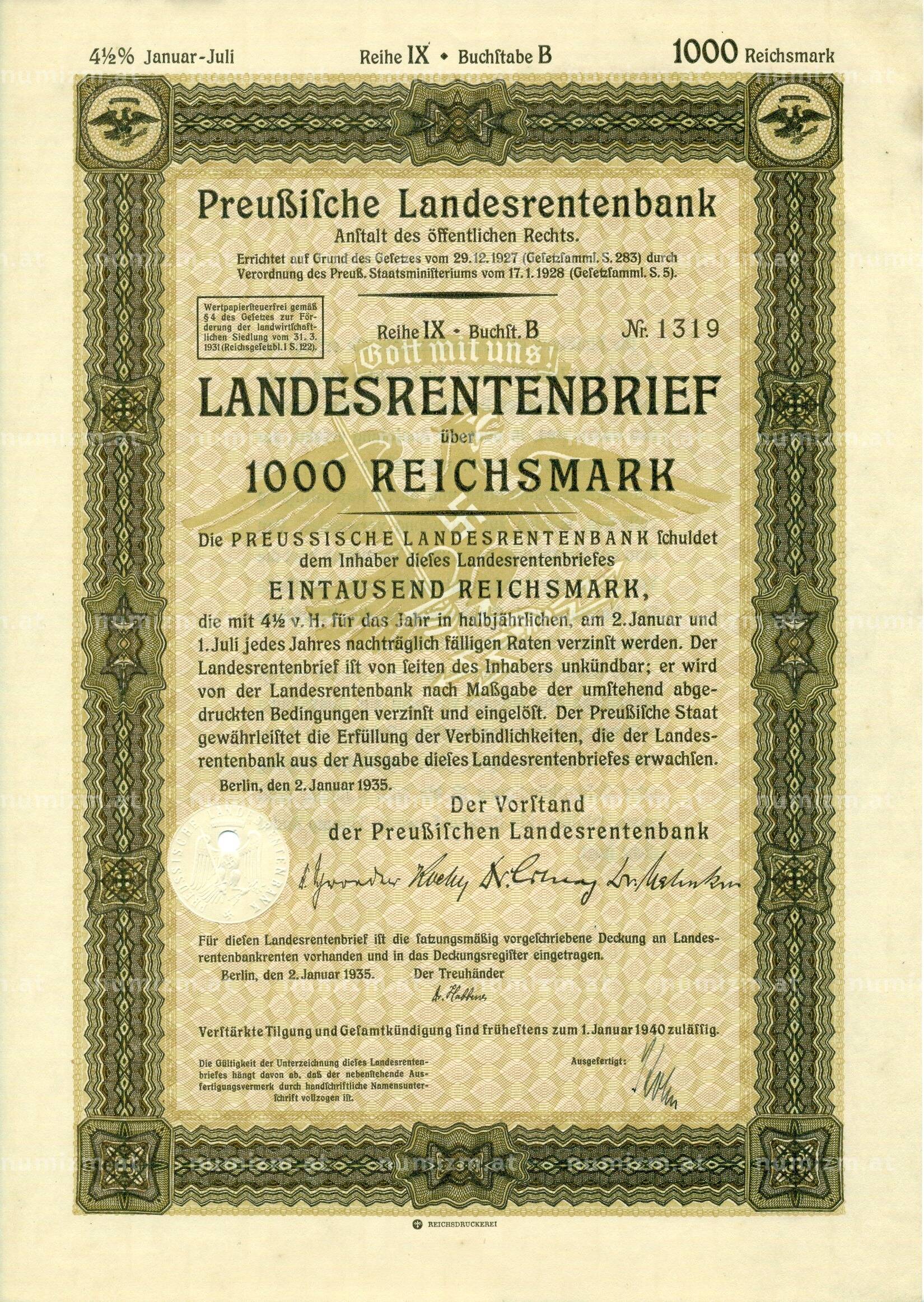 4 1/2% облигация на 1000 рейхсмарок 1935 года Германия (Прусский государственный пенсионный банк) (Артикул: B2-13309): подробные характеристики, качественные фотографии в высоком разрешении, низкая цена.