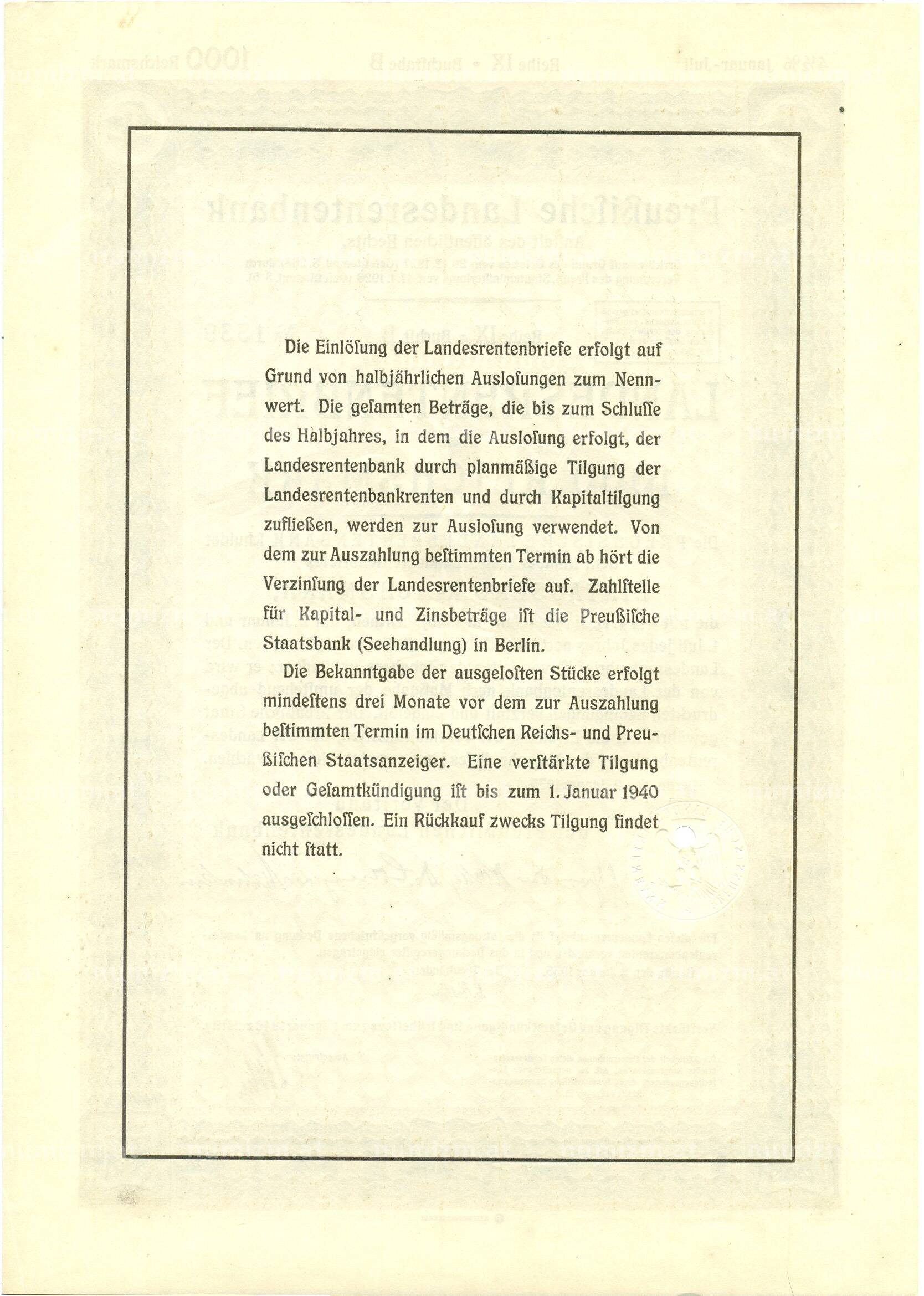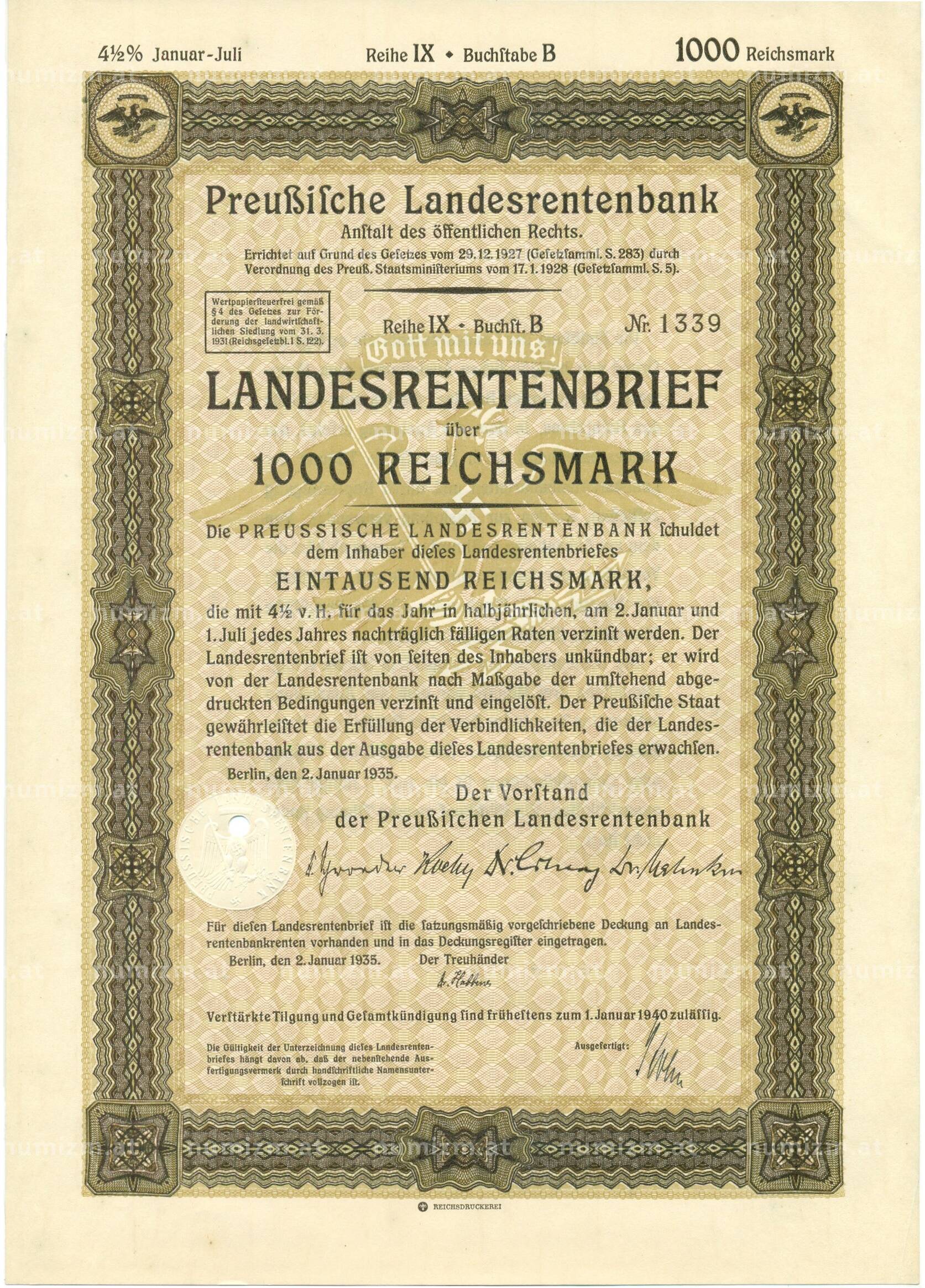 4 1/2% облигация на 1000 рейхсмарок 1935 года Германия (Прусский государственный пенсионный банк) (Артикул: B2-13312): подробные характеристики, качественные фотографии в высоком разрешении, низкая цена.