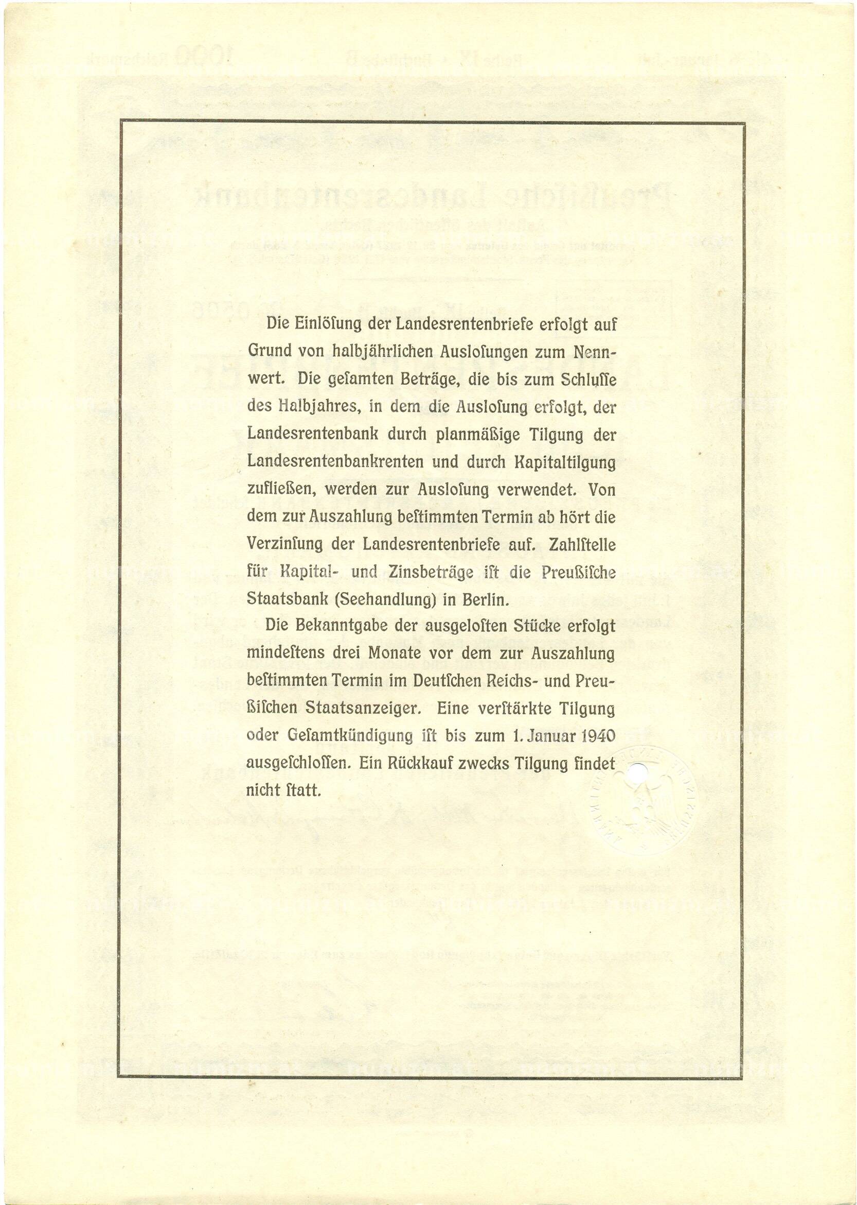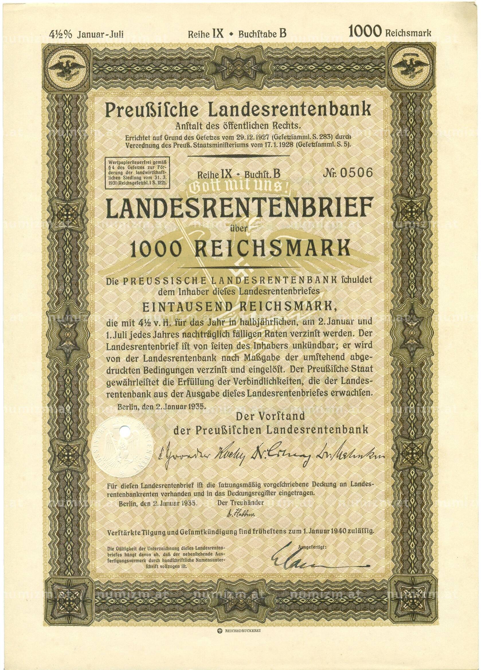 4 1/2% облигация на 1000 рейхсмарок 1935 года Германия (Прусский государственный пенсионный банк) (Артикул: B2-13316): подробные характеристики, качественные фотографии в высоком разрешении, низкая цена.
