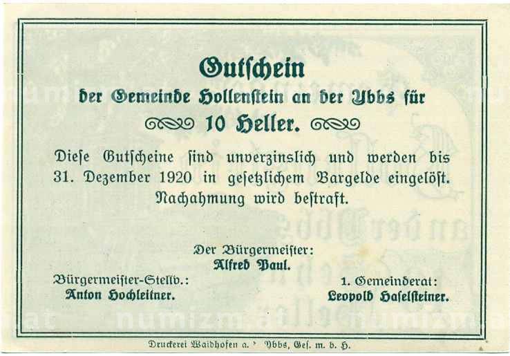 Купить 10 геллеров 1920 года Австрия — Коммуна Холленштайн (Нотгельд) по привлекательной цене можно в нашем интернет-магазине — Вам достаточно оформить заказ на сайте. Все монеты, представленные в каталоге, находятся в наличии на нашем складе.