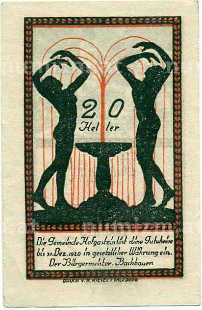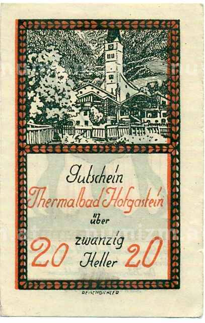 Банкнота 20 геллеров 1920 года Австрия — Коммуна Бад-Хофгаштайн (Нотгельд) (Артикул: B2-13619): подробные характеристики, качественные фотографии в высоком разрешении, низкая цена.