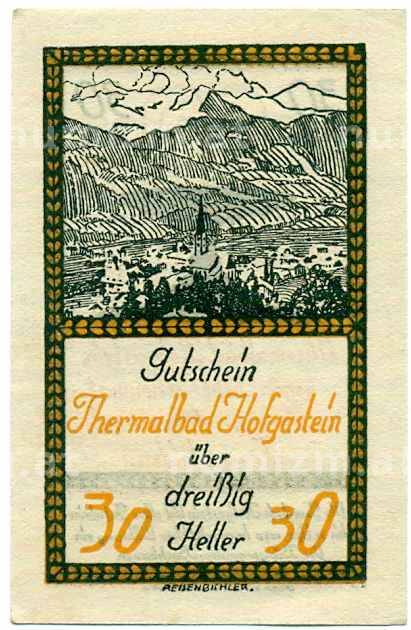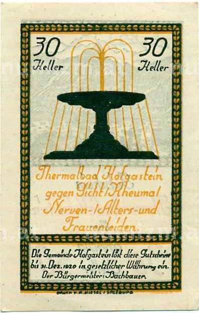 Банкнота 30 геллеров 1920 года Австрия — Коммуна Бад-Хофгаштайн (Нотгельд) (Артикул: B2-13623): подробные характеристики, качественные фотографии в высоком разрешении, низкая цена.