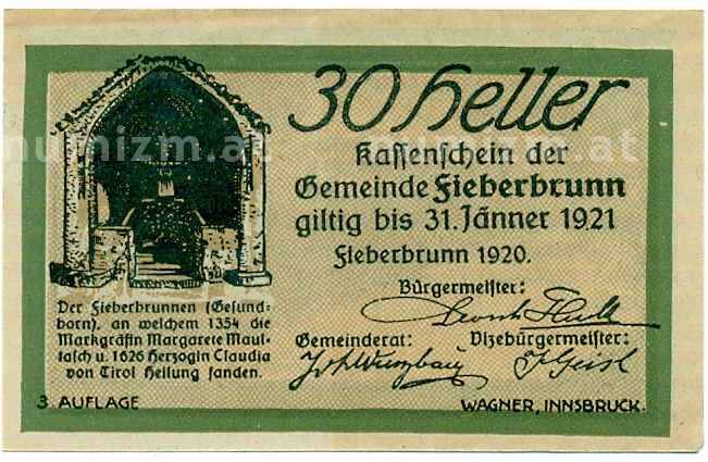 Купить 30 геллеров 1920 года Австрия — Коммуна Фибербрунн (Нотгельд) по привлекательной цене можно в нашем интернет-магазине — Вам достаточно оформить заказ на сайте. Все монеты, представленные в каталоге, находятся в наличии на нашем складе.