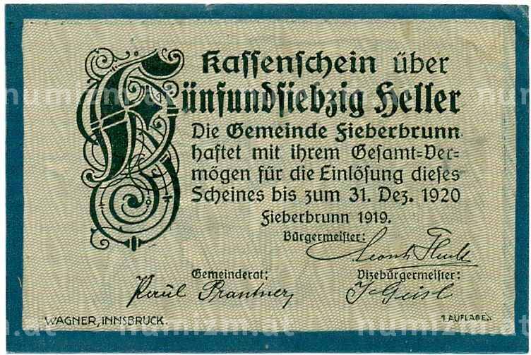 Купить 75 геллеров 1919 года Австрия — Коммуна Фибербрунн (Нотгельд) по привлекательной цене можно в нашем интернет-магазине — Вам достаточно оформить заказ на сайте. Все монеты, представленные в каталоге, находятся в наличии на нашем складе.