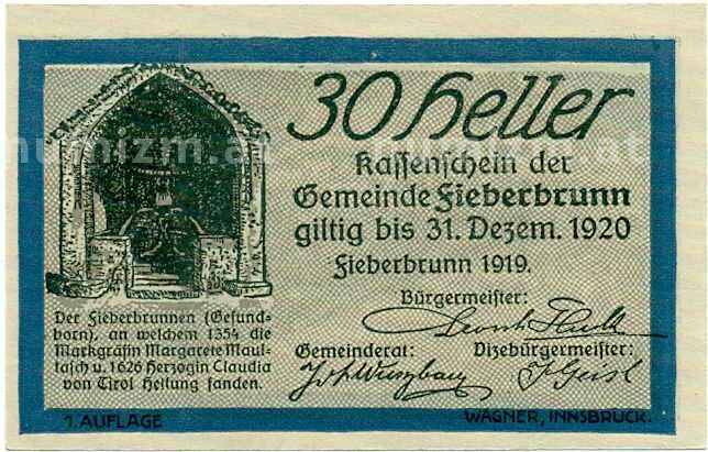 Купить 30 геллеров 1919 года Австрия — Коммуна Фибербрунн (Нотгельд) по привлекательной цене можно в нашем интернет-магазине — Вам достаточно оформить заказ на сайте. Все монеты, представленные в каталоге, находятся в наличии на нашем складе.