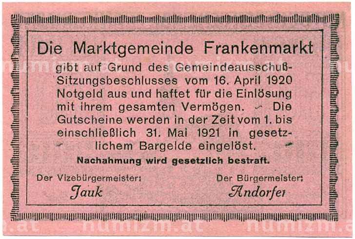 Купить 50 геллеров 1920 года Австрия — Коммуна Франкенмаркт (Нотгельд) по привлекательной цене можно в нашем интернет-магазине — Вам достаточно оформить заказ на сайте. Все монеты, представленные в каталоге, находятся в наличии на нашем складе.