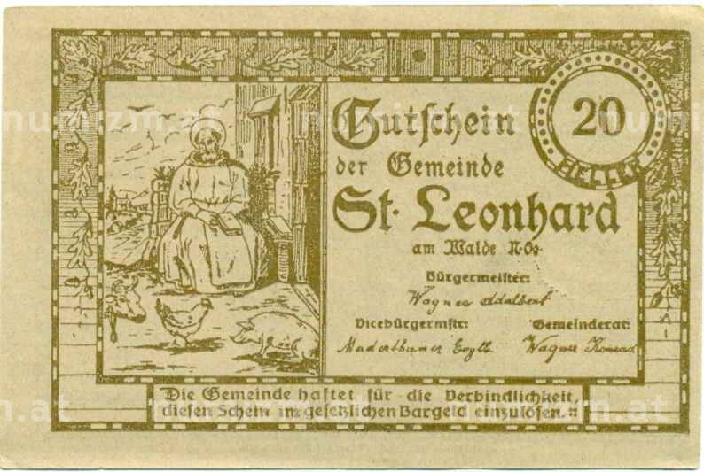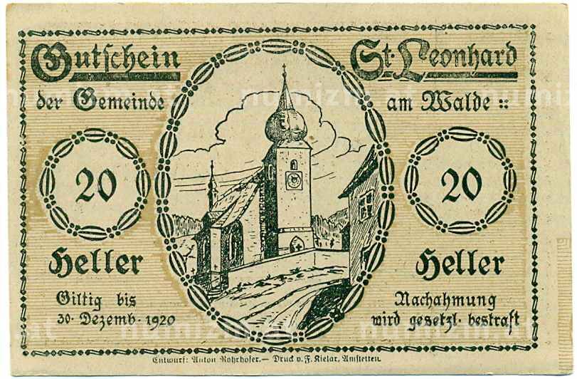 Банкнота 20 геллеров 1920 года Австрия — Санкта Леонард Ам Вальде (Нотгельд) (Артикул: B2-13911): подробные характеристики, качественные фотографии в высоком разрешении, низкая цена.