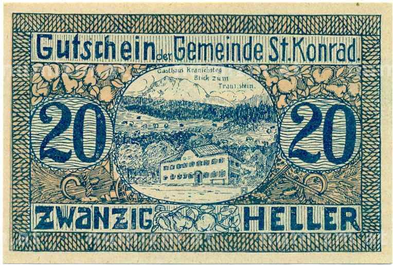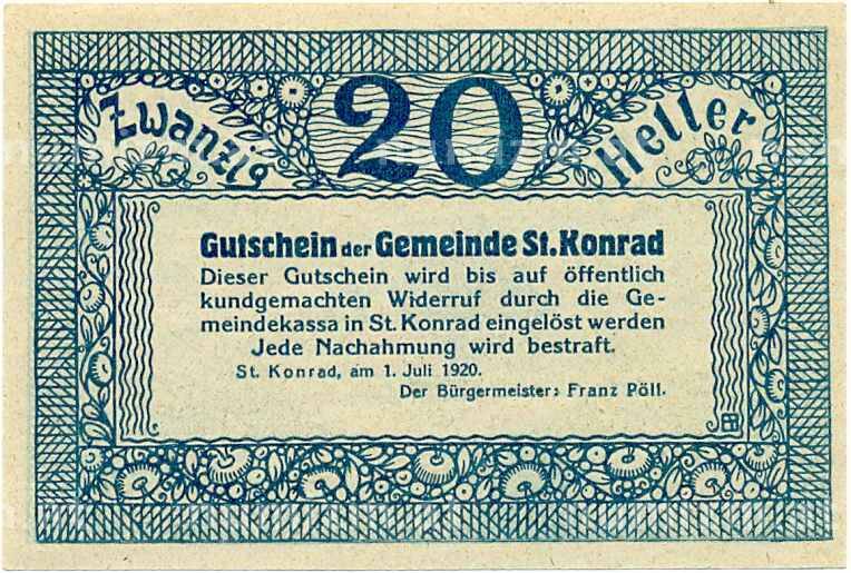 Купить 20 геллеров 1920 года Австрия — Коммуна Санкт-Конрад (Нотгельд) по привлекательной цене можно в нашем интернет-магазине — Вам достаточно оформить заказ на сайте. Все монеты, представленные в каталоге, находятся в наличии на нашем складе.