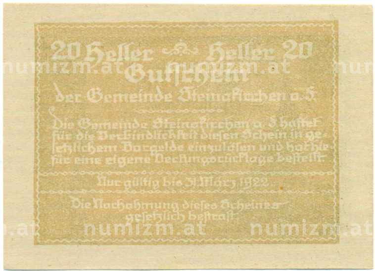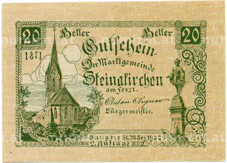 Купить 20 геллеров 1920 года Австрия — Штайнакирхен-ам-Форст (Нотгельд) по привлекательной цене можно в нашем интернет-магазине — Вам достаточно оформить заказ на сайте. Все монеты, представленные в каталоге, находятся в наличии на нашем складе.