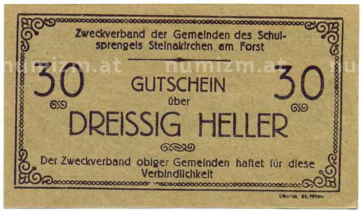 Купить 30 геллеров 1920 года Австрия — Штайнакирхен-ам-Форст (Нотгельд) по привлекательной цене можно в нашем интернет-магазине — Вам достаточно оформить заказ на сайте. Все монеты, представленные в каталоге, находятся в наличии на нашем складе.