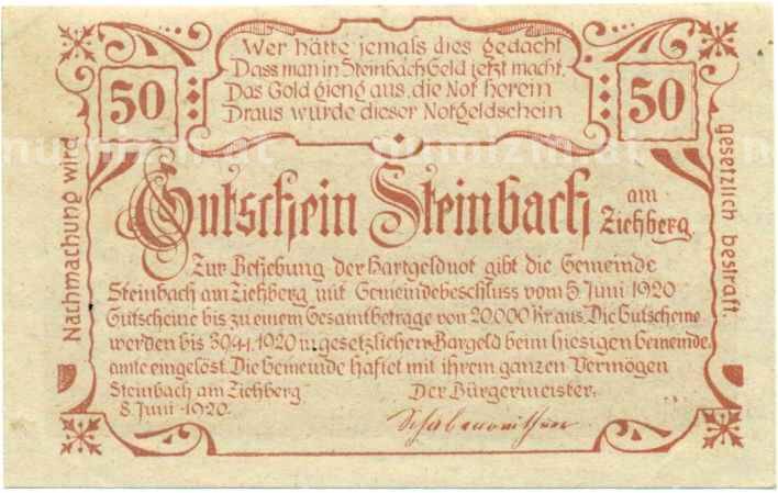 Купить 50 геллеров 1920 года Австрия — Коммуна Штайнбах-ам-Циберг (Нотгельд) по привлекательной цене можно в нашем интернет-магазине — Вам достаточно оформить заказ на сайте. Все монеты, представленные в каталоге, находятся в наличии на нашем складе.