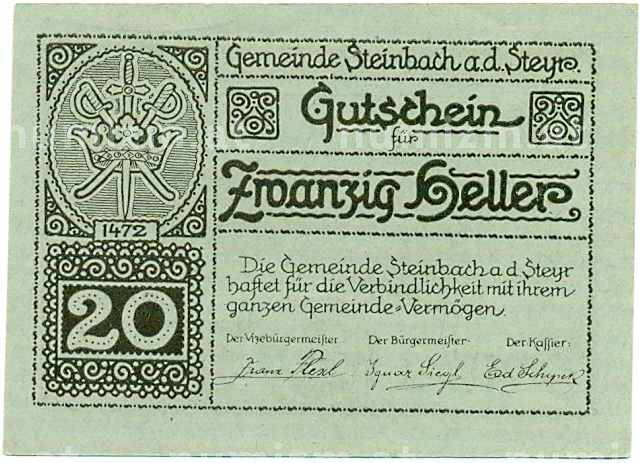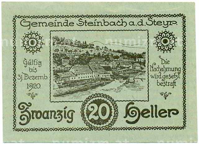 Купить 20 геллеров 1920 года Австрия — Коммуна Штайнбах-ан-дер-Штайр (Нотгельд) по привлекательной цене можно в нашем интернет-магазине — Вам достаточно оформить заказ на сайте. Все монеты, представленные в каталоге, находятся в наличии на нашем складе.