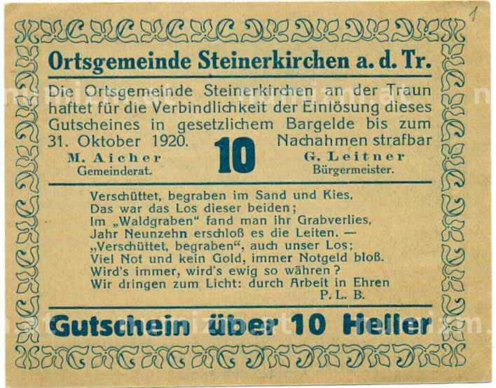 Купить 10 геллеров 1920 года Австрия — Коммуна Штайнеркирхен-на-Трауне (Нотгельд) по привлекательной цене можно в нашем интернет-магазине — Вам достаточно оформить заказ на сайте. Все монеты, представленные в каталоге, находятся в наличии на нашем складе.