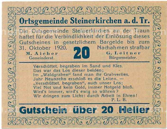 Купить 20 геллеров 1920 года Австрия — Коммуна Штайнеркирхен-на-Трауне (Нотгельд) по привлекательной цене можно в нашем интернет-магазине — Вам достаточно оформить заказ на сайте. Все монеты, представленные в каталоге, находятся в наличии на нашем складе.