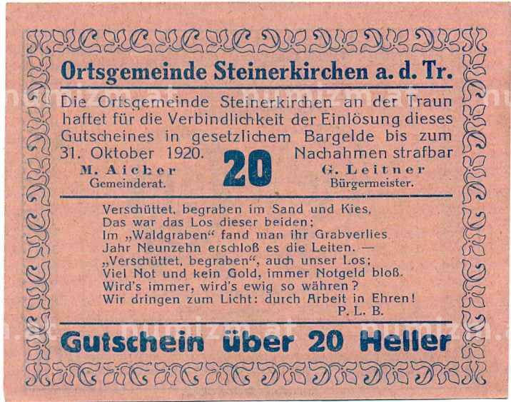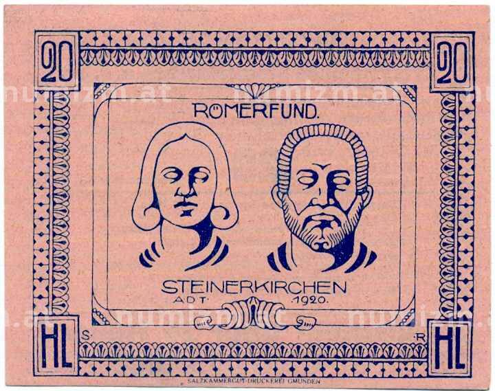 Купить 20 геллеров 1920 года Австрия — Коммуна Штайнеркирхен-на-Трауне (Нотгельд) по привлекательной цене можно в нашем интернет-магазине — Вам достаточно оформить заказ на сайте. Все монеты, представленные в каталоге, находятся в наличии на нашем складе.