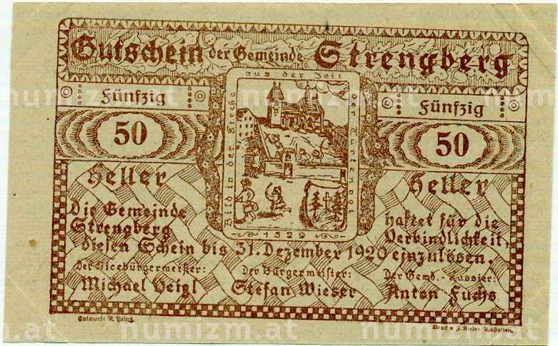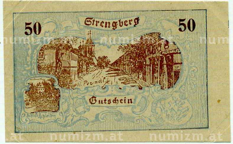Банкнота 50 геллеров 1920 года Австрия — Коммуна Штренгберг (Нотгельд) (Артикул: B2-14024): подробные характеристики, качественные фотографии в высоком разрешении, низкая цена.