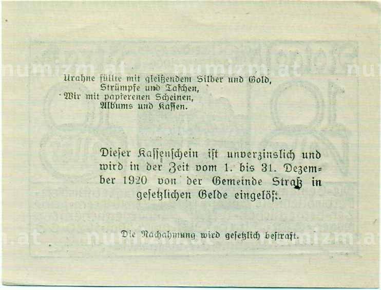 Купить 10 геллеров 1920 года Австрия — Коммуна Штрас-ин-Штайермарк (Нотгельд) по привлекательной цене можно в нашем интернет-магазине — Вам достаточно оформить заказ на сайте. Все монеты, представленные в каталоге, находятся в наличии на нашем складе.
